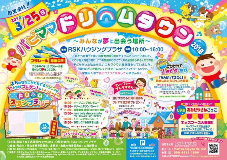【パピママドリームタウン2018】 日時:2018年3月25日(日)10:00~16:00 場所:RSKハウジングプラザ(岡山市北区撫川1575-1) ※雨天決行 >>公式情報はこちら >>facebookページ 《 … 続きを読む 2018.3.25【パピママドリームタウン2018】