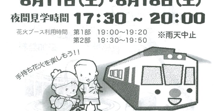 オープン以来初めてとなる夜間の一般公開を行います。 一部の展示車両のライトアップと手持ち花火を館内の一部でお楽しみいただけます。