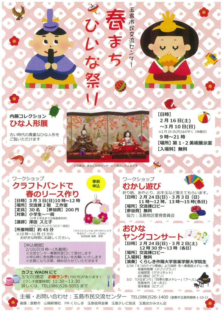 2019.2.16-3.10【春まちひいな祭り】(倉敷市/玉島市民交流センター) okayama-kodomo 7年前 【春まちひいな祭り】 期間:2019年2月16日(土)~3月10日(日) 場所:玉島市民交流センター(倉敷市玉島阿賀崎1-10-1) >>公式情報はこちら この記事をシェアするTwitterFacebookLINEで送る
