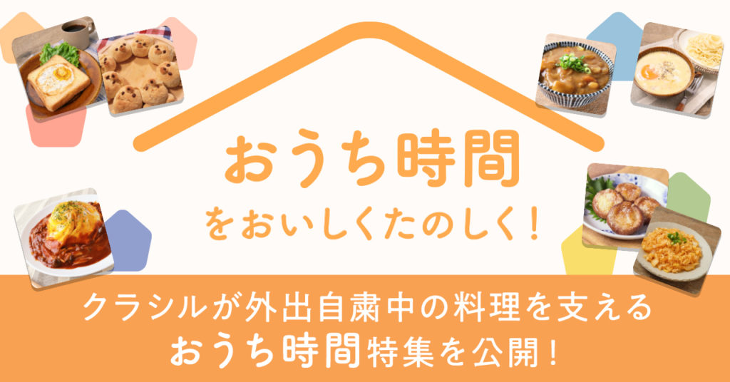 「おうち時間」特集 は、クラシルアプリの「おうち時間」タブ、またはクラシルWebページの検索窓「料理名・食材でレシピを探す」にて「おうち時間」と検索してご確認ください。