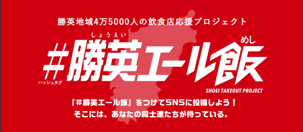 テイクアウトまたはデリバリーしたメニューを撮影し、「#勝英エール飯」とハッシュタグをつけて、SNS「Facebook」「Twitter」「Instagram」などで投稿します。