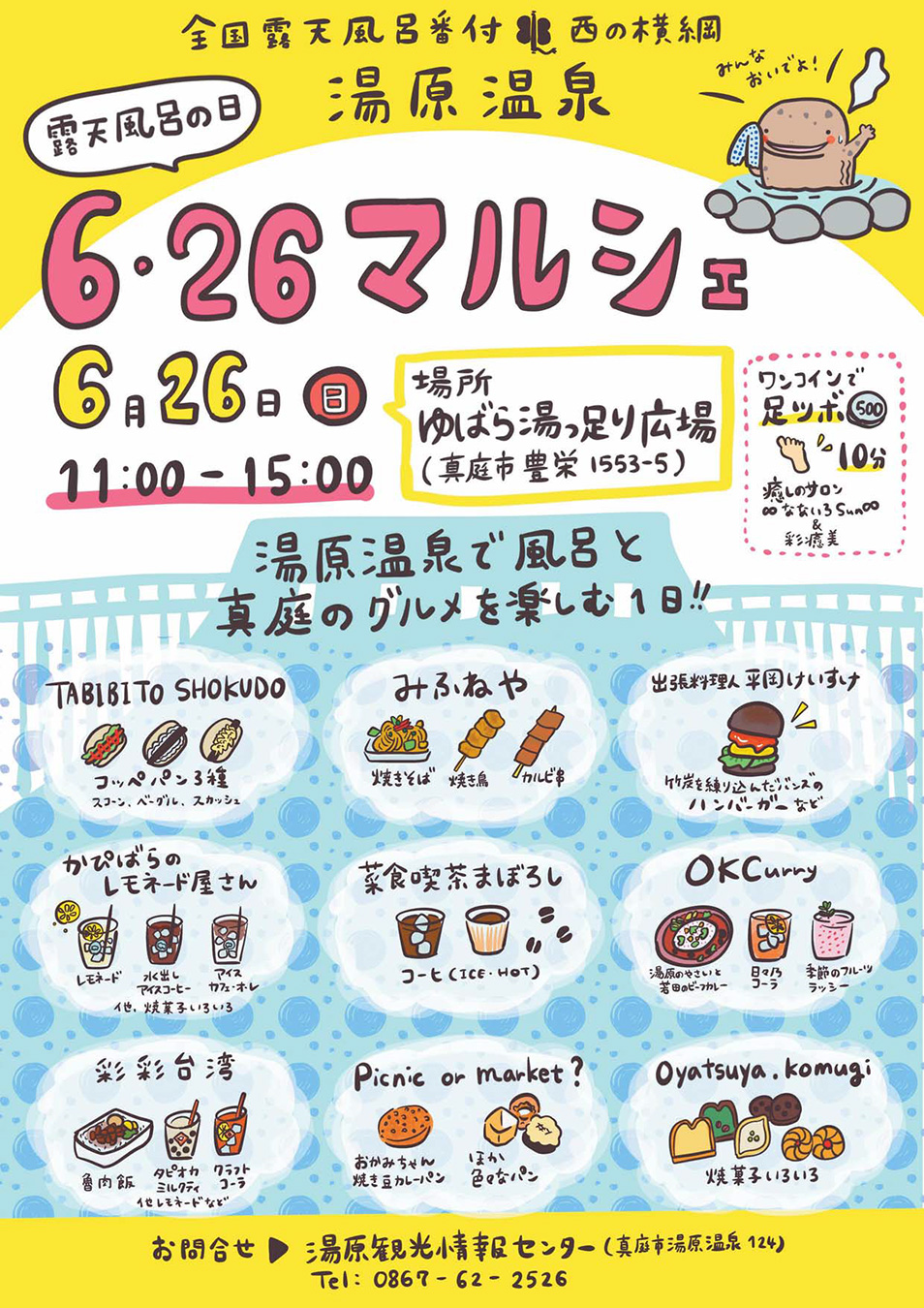 真庭市内外から集まる人気店グルメを味わえるほか、ワンコインで足つぼ体験(10分)もできます。