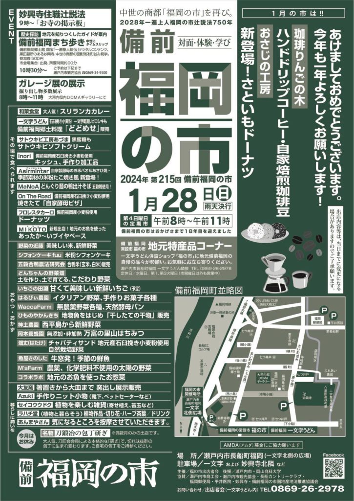 2024.1.28【第215回備前福岡の市】(瀬戸内市) okayama-kodomo 2年前 【第215回備前福岡の市】 日時:2024年1月28日(日)8:00~11:00 場所:一文字うどん北側の広場(瀬戸内市長船町福岡) ※雨天決行 >>Facebookページ 毎月第4日曜日開催! この記事をシェアするTwitterFacebookLINEで送る