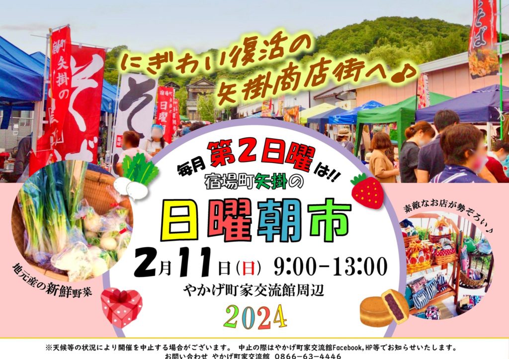 2024.2.11【宿場町矢掛 日曜朝市!】(矢掛町) okayama-kodomo 2年前 【宿場町矢掛 日曜朝市!】 日時:2024年2月11日(日)8:00~12:00 場所:やかげ町家交流館 よこ(小田郡矢掛町矢掛) >>Facebookページ >>Facebookイベントページ 毎月第2日曜は!宿場町矢掛 の 日曜朝市! この記事をシェアするTwitterFacebookLINEで送る