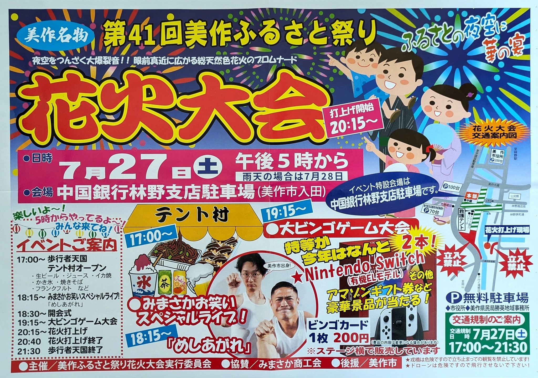 日時:2024年7月27日(土)17:00~21:00頃(花火打ち上げ20:15~20:40予定)