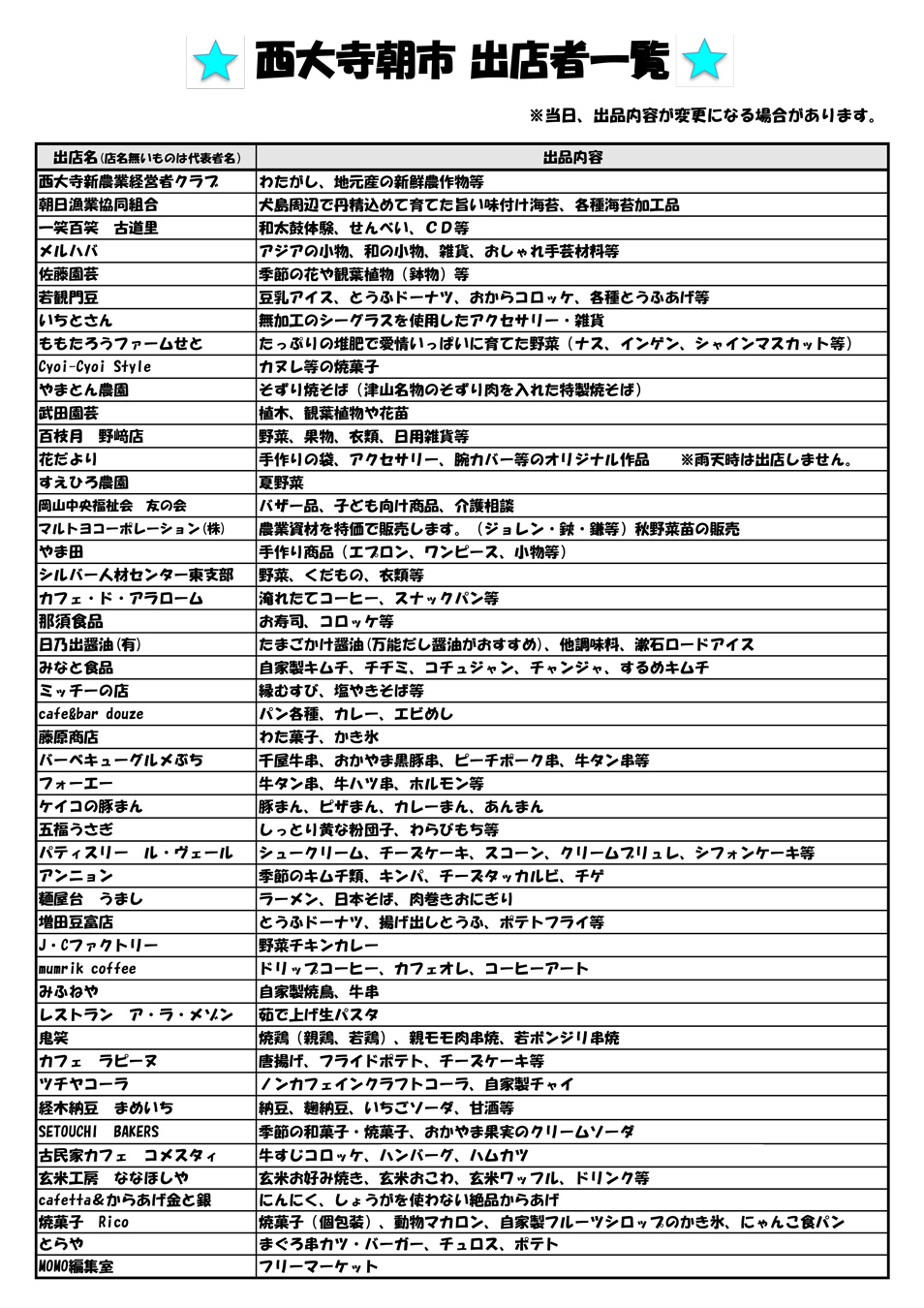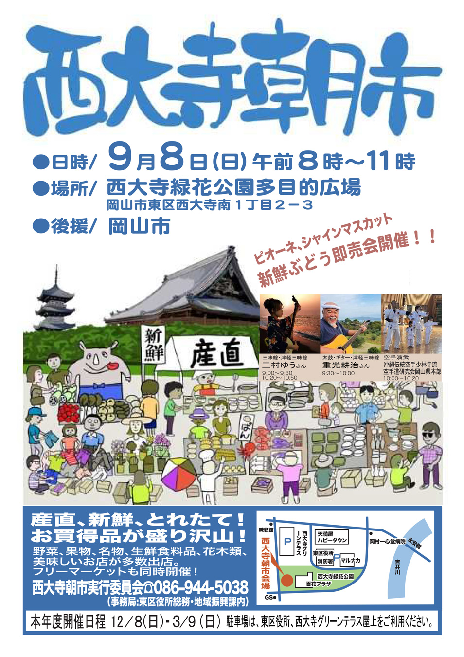 2024.08.30 岡山県内のイベント okayama-kodomo 2024.9.8【西大寺朝市】(岡山市東区) ポスト シェア はてブ 送る Pocket 【西大寺朝市】 日時:2024年9月8日(日)8:00~11:00 場所:西大寺緑花公園 多目的広場(岡山市東区西大寺南1-2-3) ※雨天決行 >>公式情報はこちら 新鮮!お買い得な商品が盛りだくさん! シェア! ポスト シェア はてブ 送る Pocket feedly