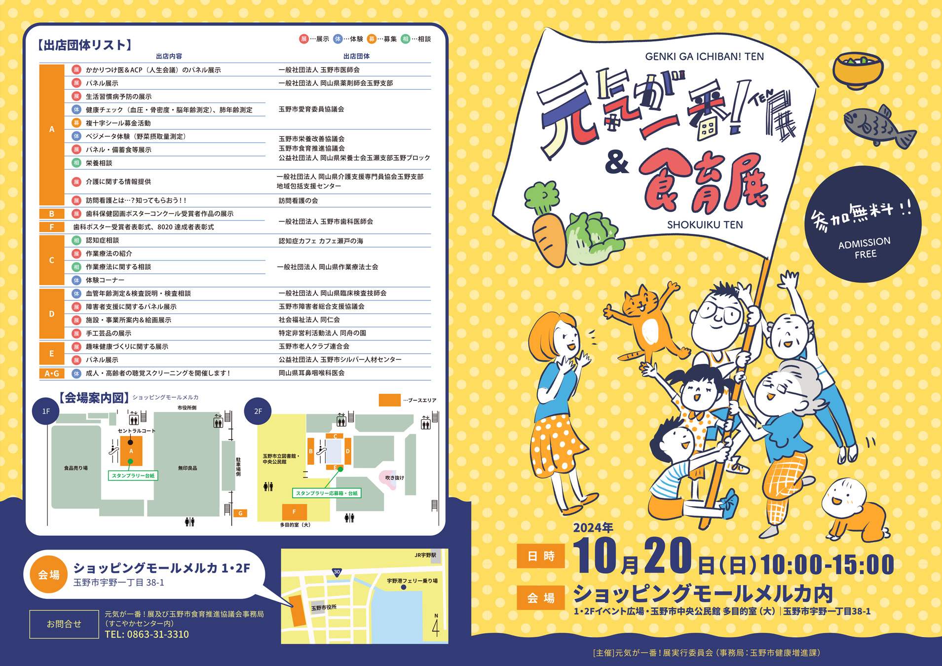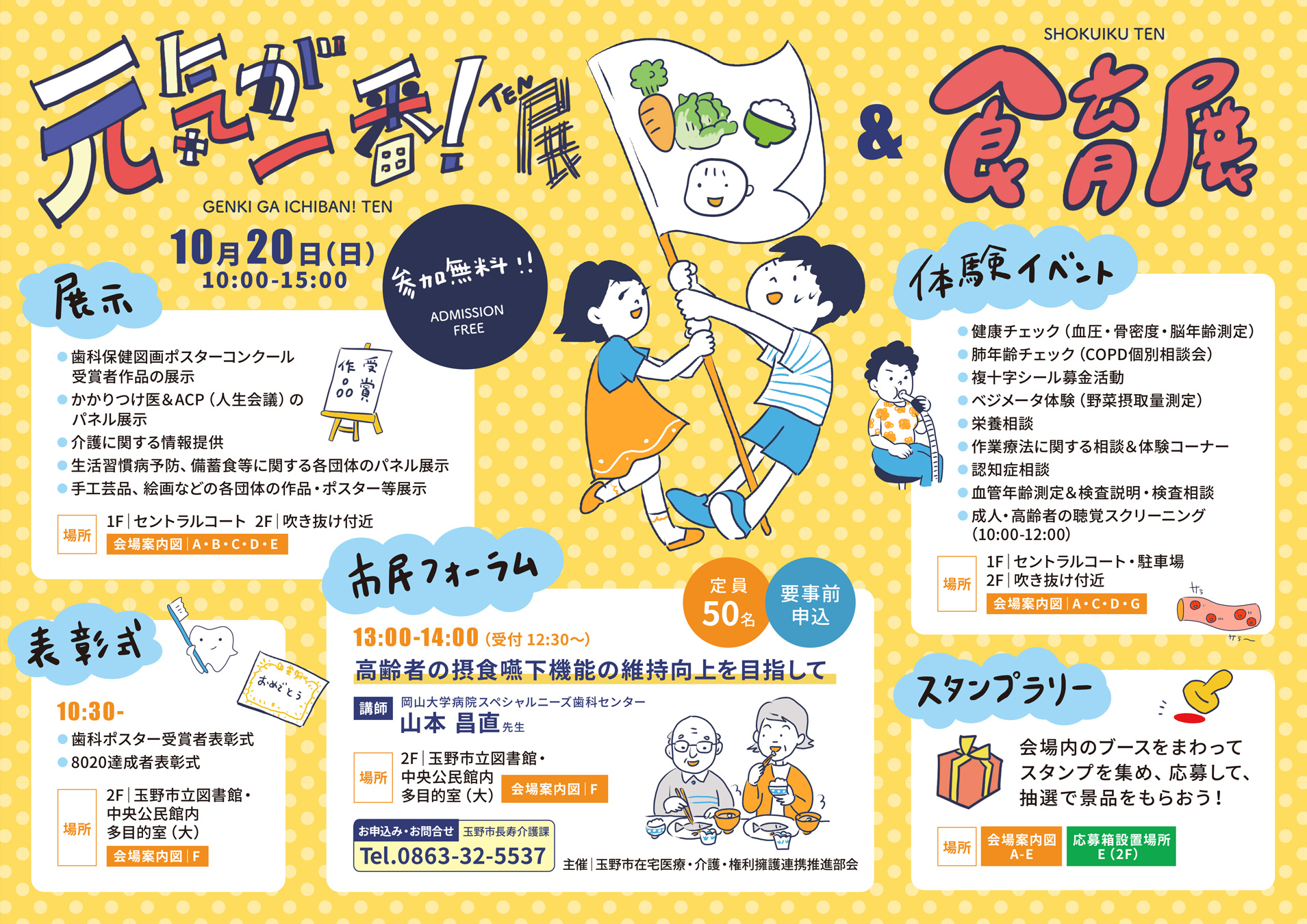 介護予防や食育推進など健康づくりについて市民一人ひとりが考えるきっかけとして、各団体の活動や啓発展示、健康チェック、肺年齢チェック、ベジメータ体験(野菜摂取量測定)、歯科ポスター受賞者等表彰式、市民フォーラム(講演会)、スタンプラリー等を行います!