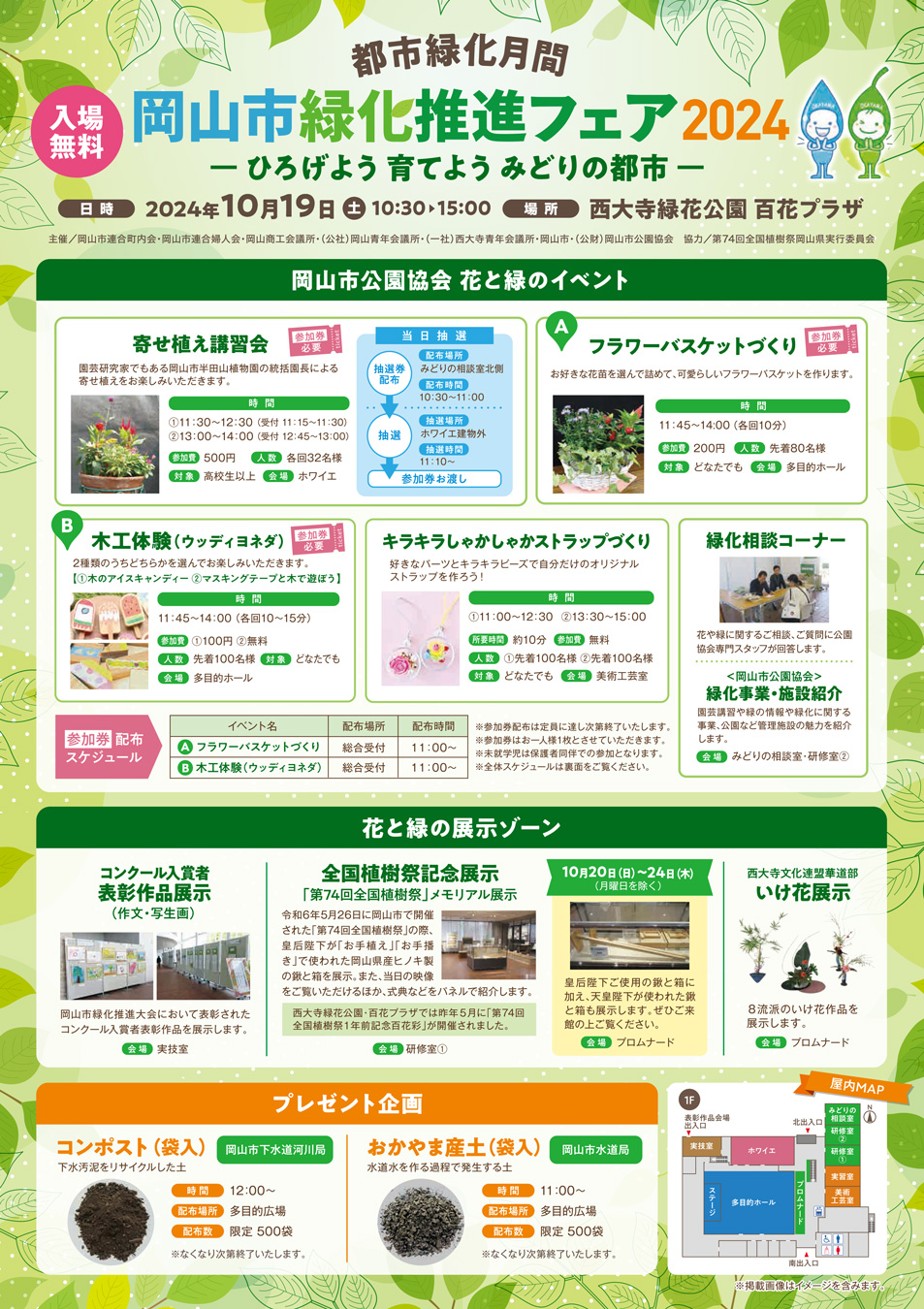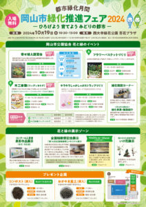 毎年10月に全国各地で緑に関する行事を行う「都市緑化月間」の締めくくりとして、緑化に関する表彰を行う式典「緑化推進大会」及び、多くの市民のみなさまに花や緑に親しんでいただく「緑化推進フェア2024」を開催します。
