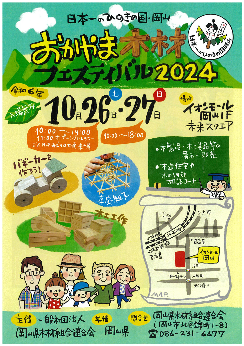 岡山県内の木材関係者が一堂に集まる、木製品の販売、ワークショップ、PRを実施します。