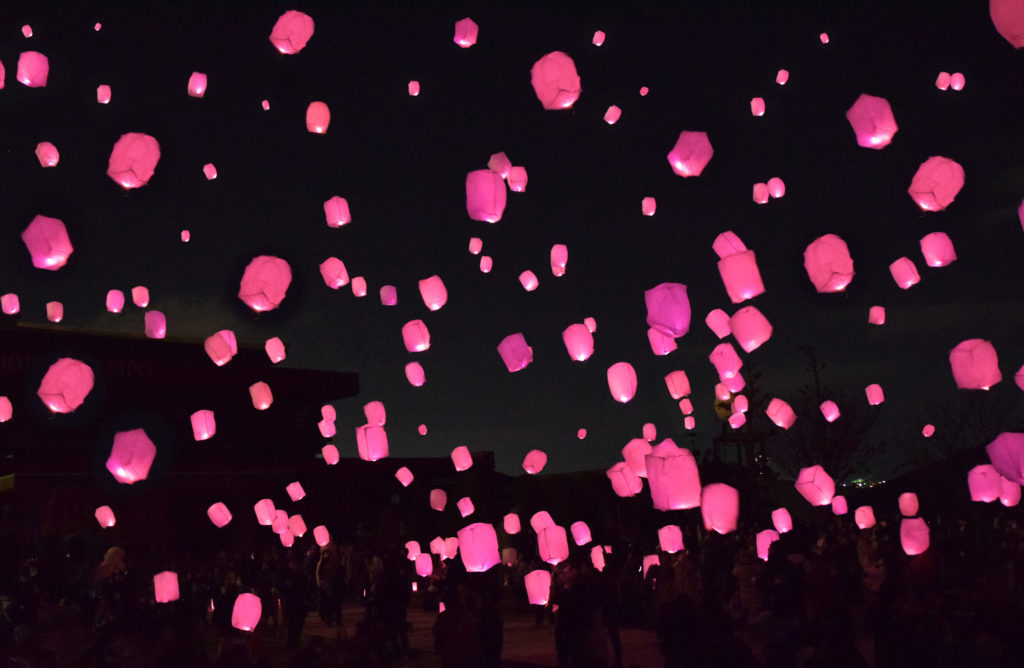 イベントのクライマックスではランタンを夜空に打ち上げます。桜を模したピンク色のスカイランタンが幻想的に夜空を彩る景色をお楽しみいただけます。