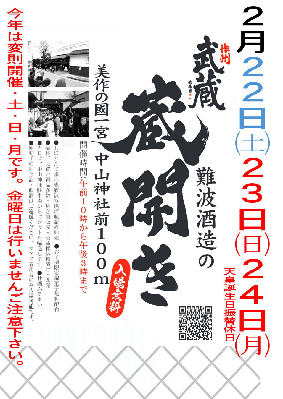 津山市の蔵元・難波酒造で「作州武蔵」蔵開きが開催されます。