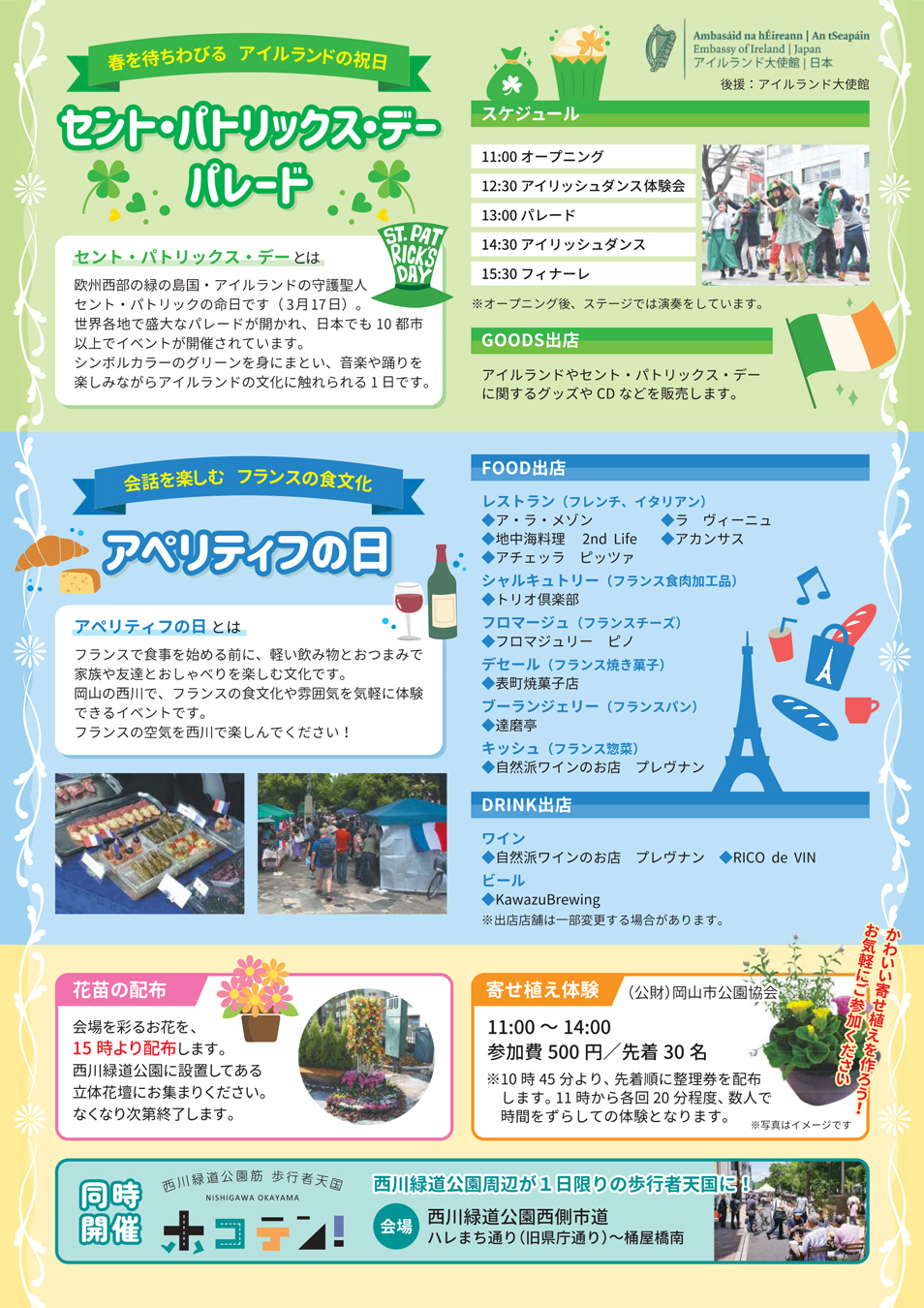 3月2日のハーモニーフェスタでは、春を待ちわびるアイルランドの祝日による「セント・パトリックス・パレード」や、会話を楽しむフランスの食文化「アペリティフの日」による飲食イベントを開催します!