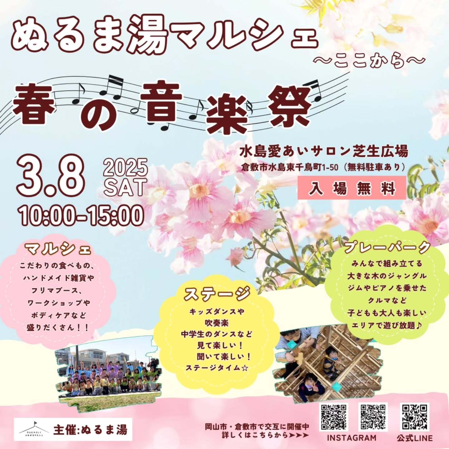 2025.02.27 岡山県内のイベント okayama-kodomo 2025.3.8【ぬるま湯マルシェ〜ここから〜】(倉敷市水島) ポスト シェア はてブ 送る Pocket 【ぬるま湯マルシェ〜ここから〜】 日時:2025年3月8日(土)10:00~15:00 場所:水島愛あいサロン芝生広場(倉敷市水島東千鳥町1-50) >>公式instagram ヒトにやさしく地球にやさしくつながるマルシェ シェア! ポスト シェア はてブ 送る Pocket feedly
