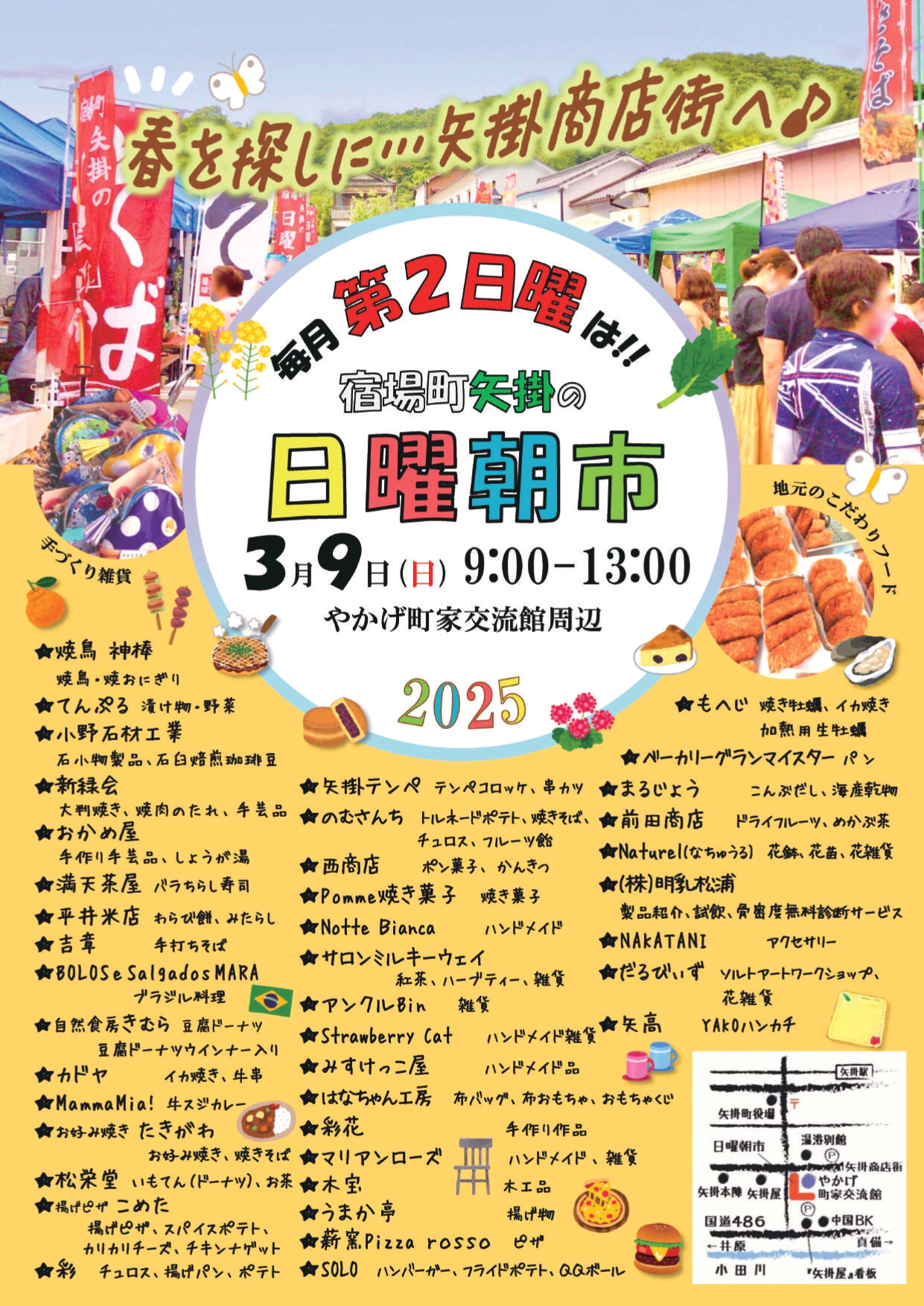 2025.03.01 岡山県内のイベント okayama-kodomo 2025.3.9【宿場町矢掛 日曜朝市!】(小田郡矢掛町) ポスト シェア はてブ 送る Pocket 【宿場町矢掛 日曜朝市!】 日時:2025年3月9日(日)8:00~12:00 場所:やかげ町家交流館周辺(小田郡矢掛町矢掛2639) >>Facebookイベントページ 毎月第2日曜は!宿場町矢掛 の 日曜朝市! シェア! ポスト シェア はてブ 送る Pocket feedly