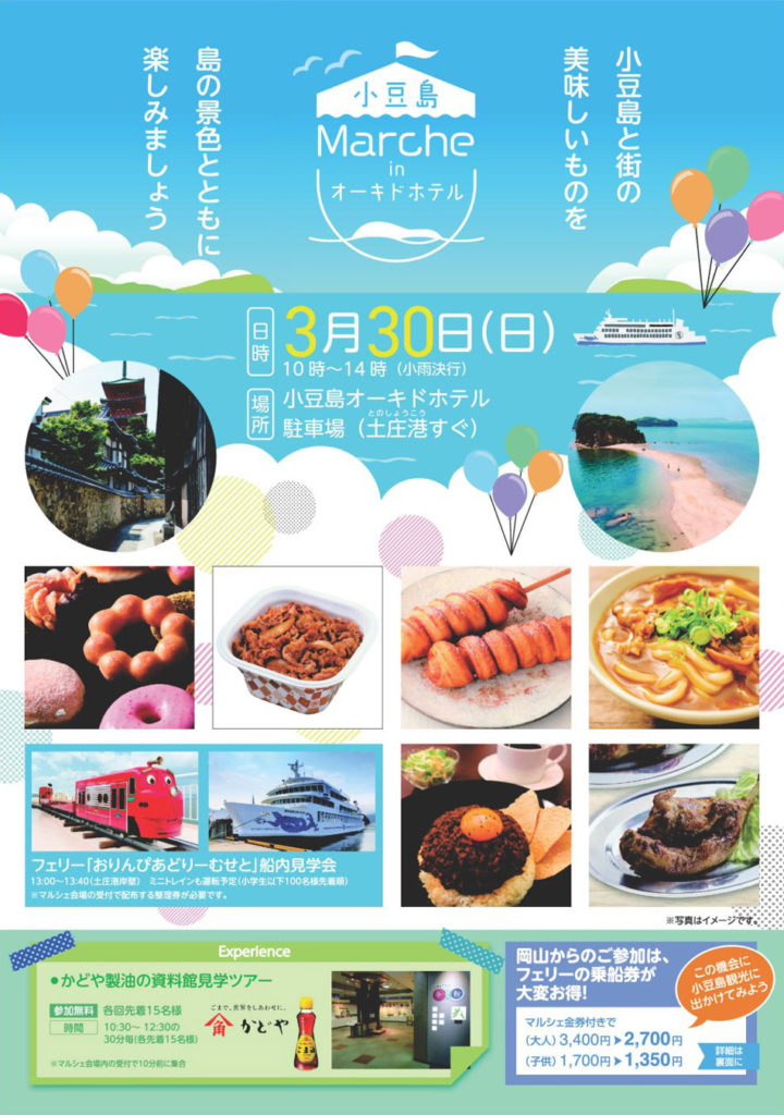 小豆島の美味しいグルメと街のグルメを楽しむ『小豆島マルシェ in オーキドホテル』を3月30日(日)土庄港すぐのオーキドホテル駐車場で開催します。