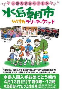 今度の日曜日、水島愛あい芝生広場で午前9時~12時まで「水島入園入学おめでとう朝市」を開催します。