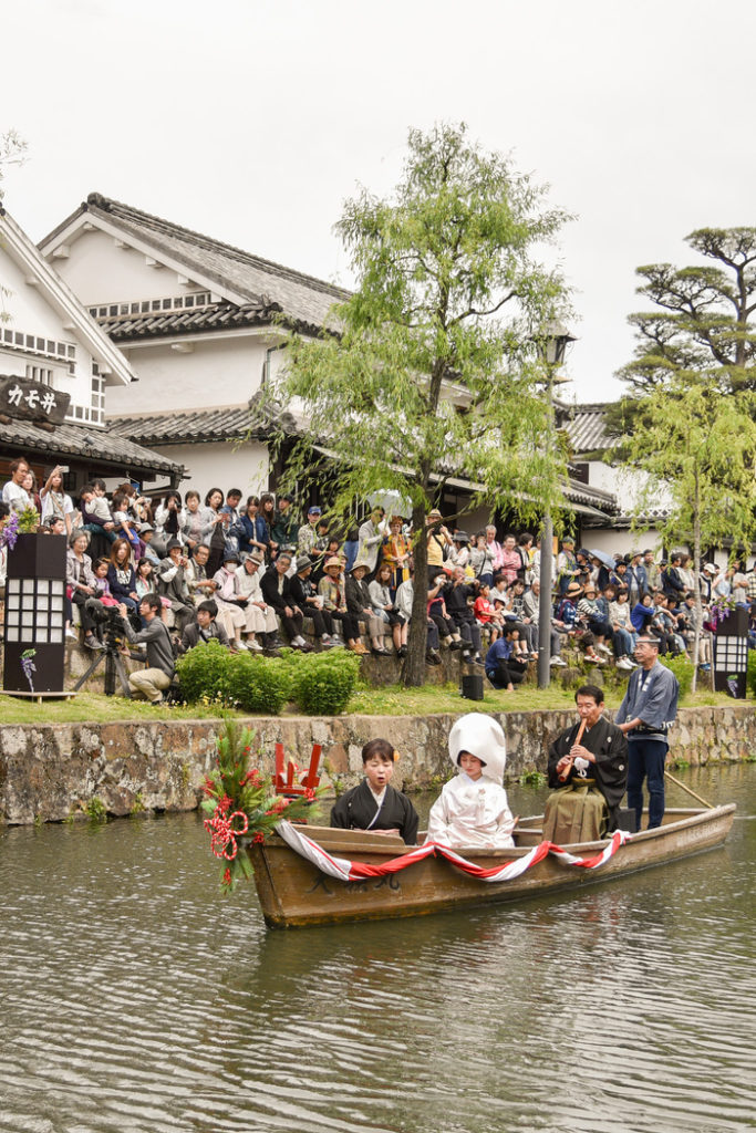 倉敷小町が、紅白装飾の川舟には花嫁衣裳を、市花「ふじ」をテーマに装飾された川舟には藤娘衣装をまとい、歌い手・演奏者と共に華やかな風景を演出します。