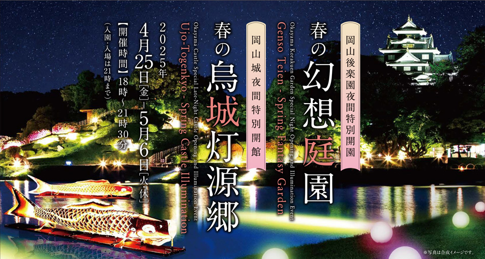 岡山後楽園では園内を幻想的にライトアップし、様々なイベントを楽しんでいただく夜間特別開園「春の幻想庭園」を開催します。