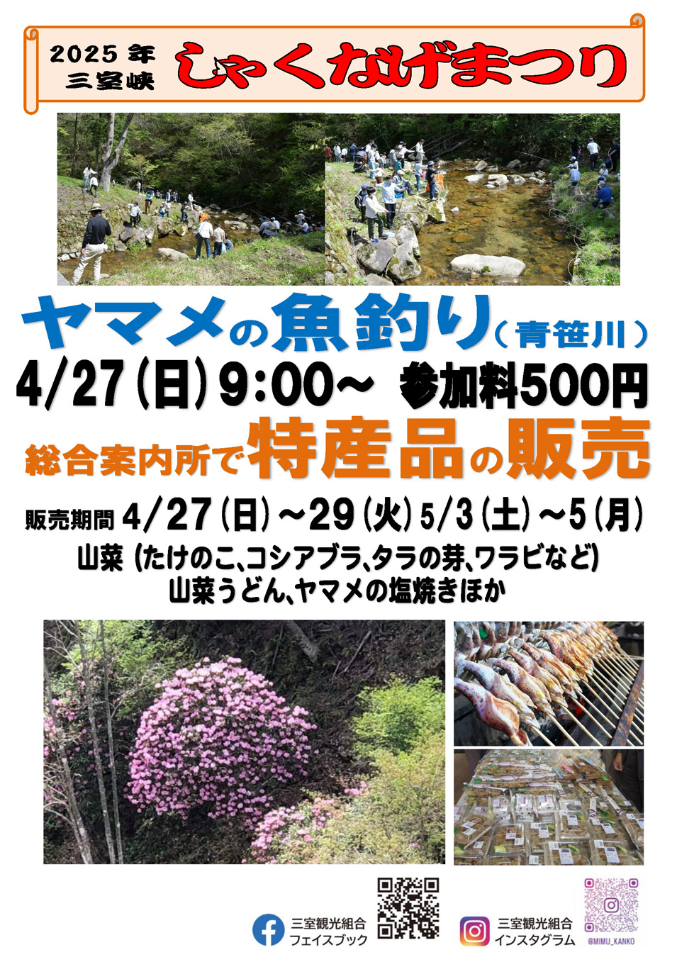 ※「うどん」「山菜」「ヤマメの塩焼き」など特産品の販売は4月27日(日)~29日(火祝)と5月3日(土)~5日(月祝)まで三室総合案内所で行います。