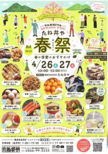 2025.04.20 岡山県内のイベント okayama-kodomo 2025.4.26-27【たね井や春祭】(総社市) ポスト シェア はてブ 送る Pocket 【たね井や春祭】 日時:2025年4月26日(土)、27日(日) 場所:農産物直売所 たね井や(総社市種井441-1) >>公式サイト >>Facebookページ >>公式instagram たね井や春のイベント シェア! ポスト シェア はてブ 送る Pocket feedly