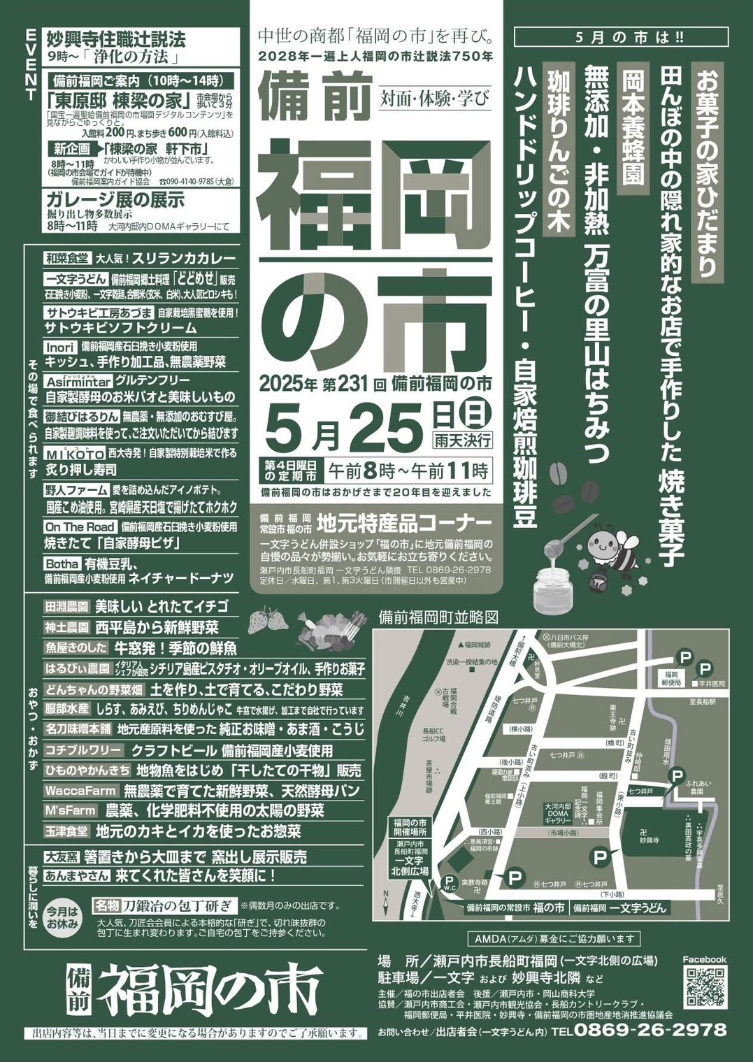 2025.05.17 岡山県内のイベント okayama-kodomo 2025.5.25【第231回備前福岡の市】(瀬戸内市) ポスト シェア はてブ 送る Pocket 【第231回備前福岡の市】 日時:2025年5月25日(日)8:00~11:00 場所:一文字うどん北側の広場(瀬戸内市長船町福岡) ※雨天決行 >>Facebookページ 毎月第4日曜日開催! シェア! ポスト シェア はてブ 送る Pocket feedly