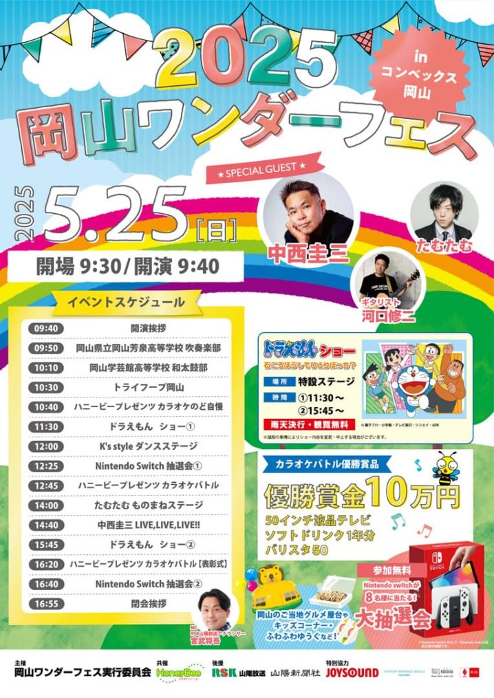メインステージではRSK山陽放送の宮武将吾アナウンサーをMCに、中西圭三ライブ・たむたむものまねライブ・ドラえもんショー・強者によるカラオケバトルやのど自慢大会・地元ダンスチームによるダンス・地元高校生による和太鼓・吹奏楽などの演奏を開催します。