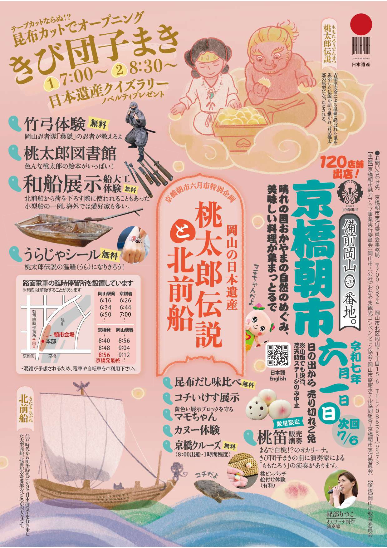 2025.05.24 岡山県内のイベント okayama-kodomo 2025.6.1【備前岡山京橋朝市】(岡山市北区) ポスト シェア はてブ 送る Pocket 【備前岡山京橋朝市】 日時:2025年6月1日(日)5:00~10:00頃 場所:京橋西詰め旭川河川敷広場 及び 堤防緑地一帯(岡山市北区京橋町) ※雨天決行 >>Facebookページ >>公式サイト 京橋西詰め旭川河川敷広場にて毎月第1日曜日開催! シェア! ポスト シェア はてブ 送る Pocket feedly