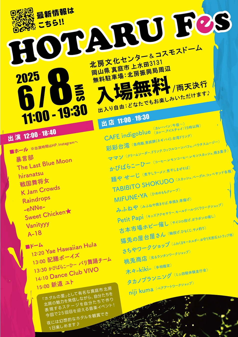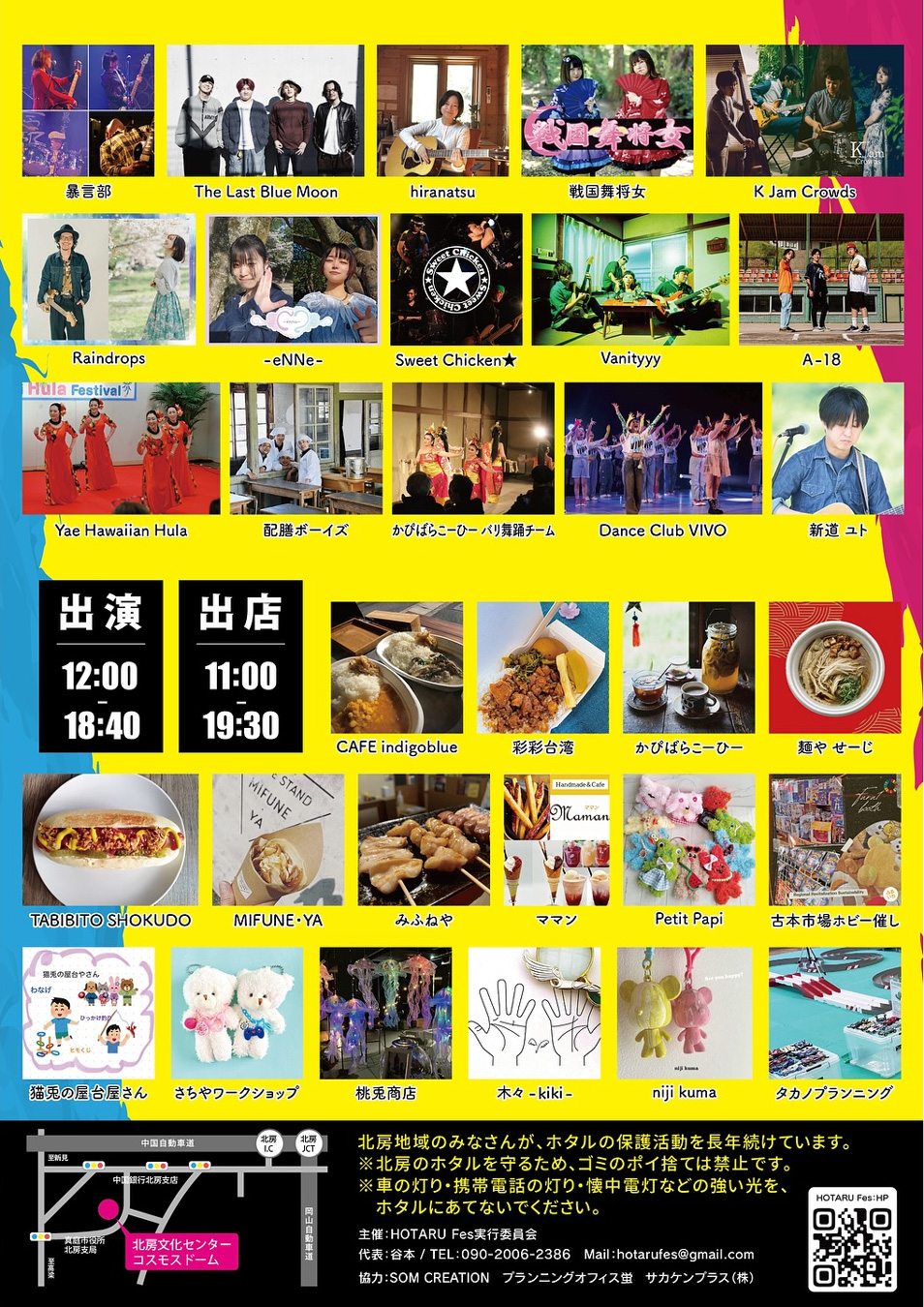 地元北房を中心とし、岡山県内外から多くのミュージシャンやアーティスト、音楽・イベント好きが集まり、毎年ホタルが舞う6月に開催されるHOTARU Fes。