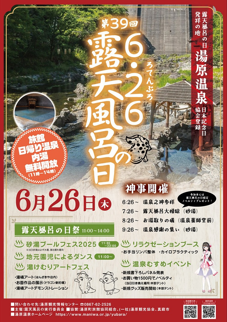 『 露天風呂の日 』発祥の地、湯原温泉では旅館・日帰り温泉のお風呂を6月26日限定で無料開放いたします!