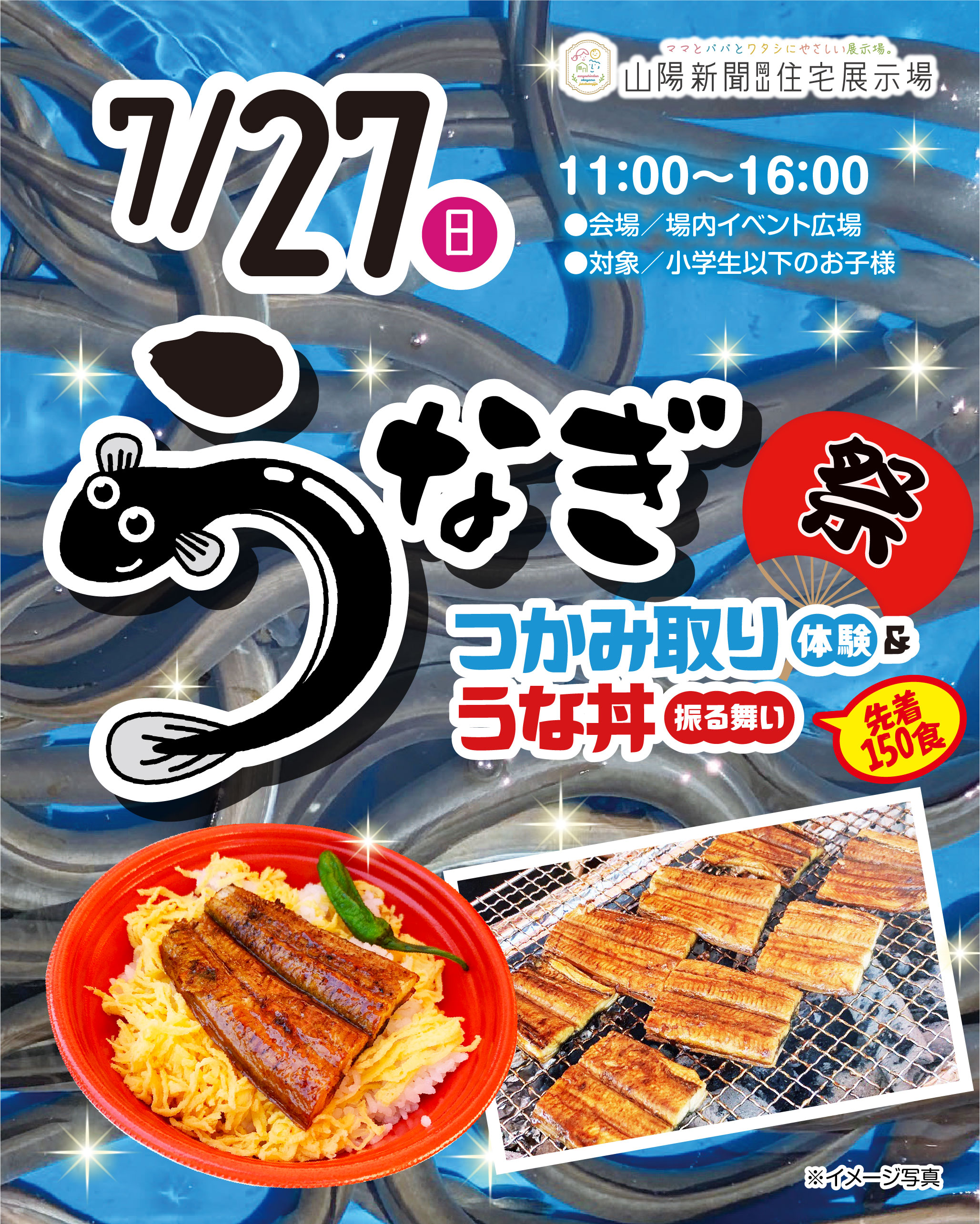 ※つかみ取りのうなぎは、つかみ取り専用でお持ち帰りいただけません。うな丼は予め調理したものを現場で焼き上げお召し上がりいただきます。