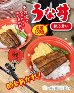 ※うな丼引換券はアンケートにお答えの上、モデルハウス1棟見学の方、一家族様2食、お一人様は1食プレゼントします。うな丼は数に限りがございます。
