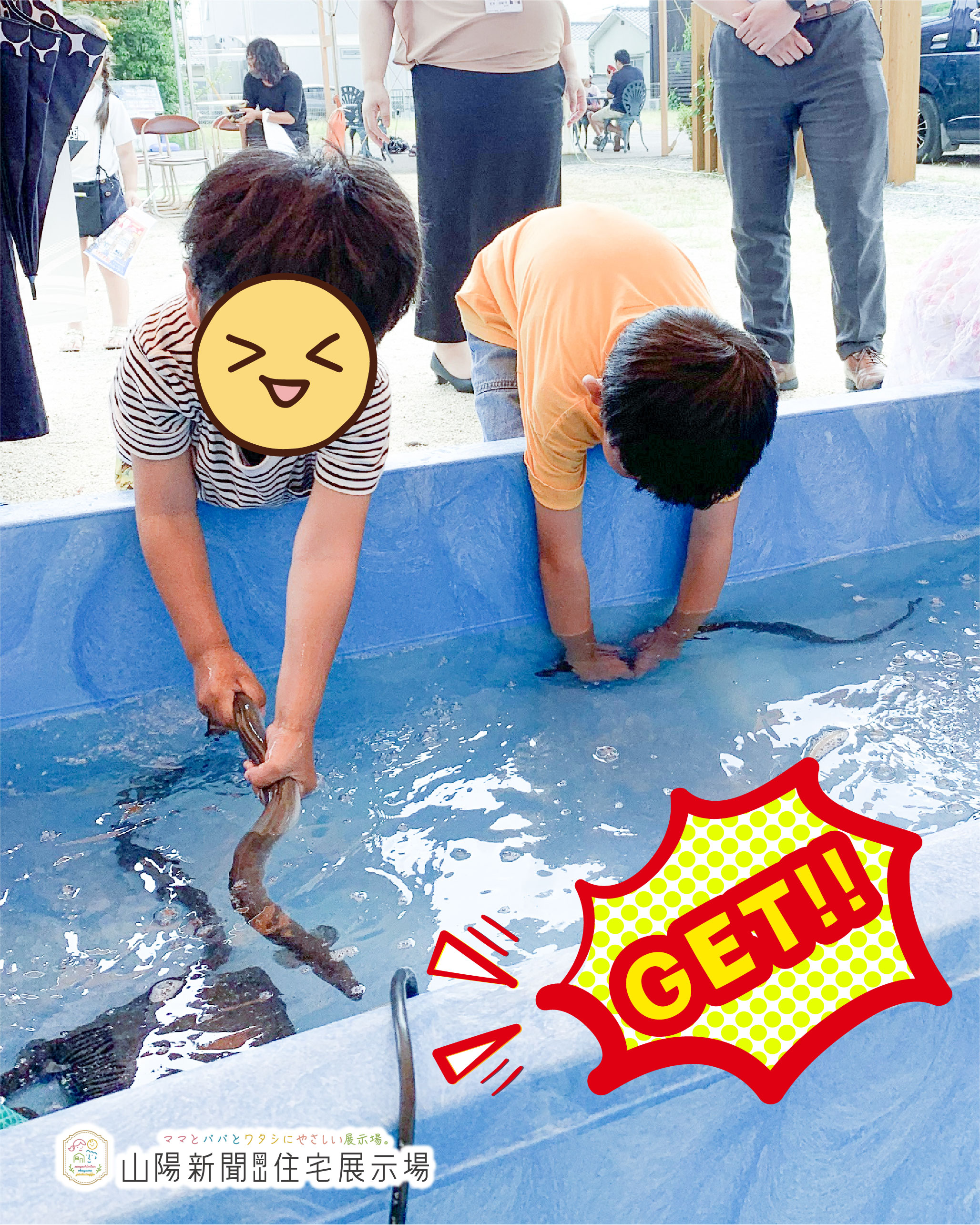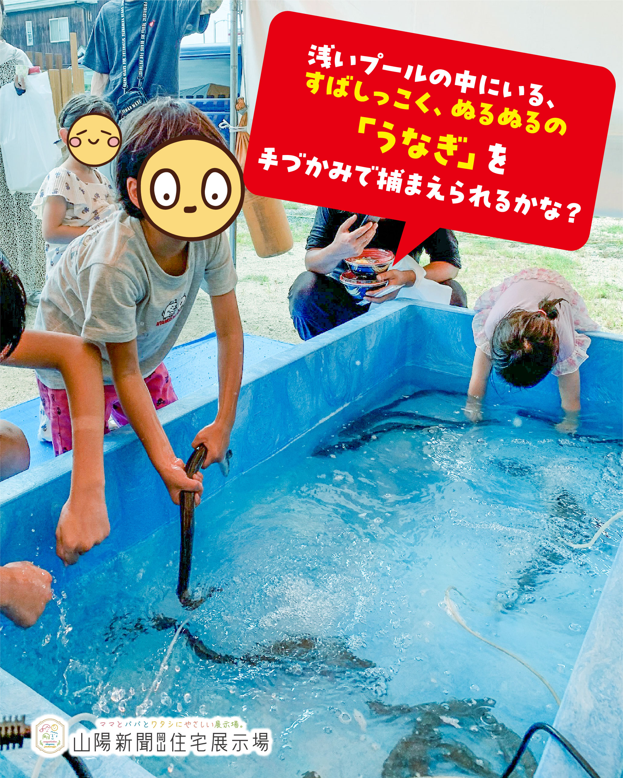 浅いプールの中にいる、ぬるぬるの「うなぎ」を手づかみで捕まえられるかな?