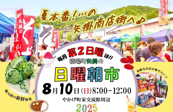2025.08.02 岡山県内のイベント okayama-kodomo 2025.8.10【宿場町矢掛 日曜朝市!】(矢掛町) ポスト シェア はてブ 送る Pocket 【宿場町矢掛 日曜朝市!】 日時:2025年8月10日(日)8:00~12:00 場所:やかげ町家交流館周辺(小田郡矢掛町矢掛2639) >>Facebookページ 毎月第2日曜は!宿場町矢掛 の 日曜朝市! 令和7年度(第71回)青少年読書感想文全国(岡山県)コンクール課題図書・指定図書2025年6月18日 シェア! ポスト シェア はてブ 送る Pocket feedly