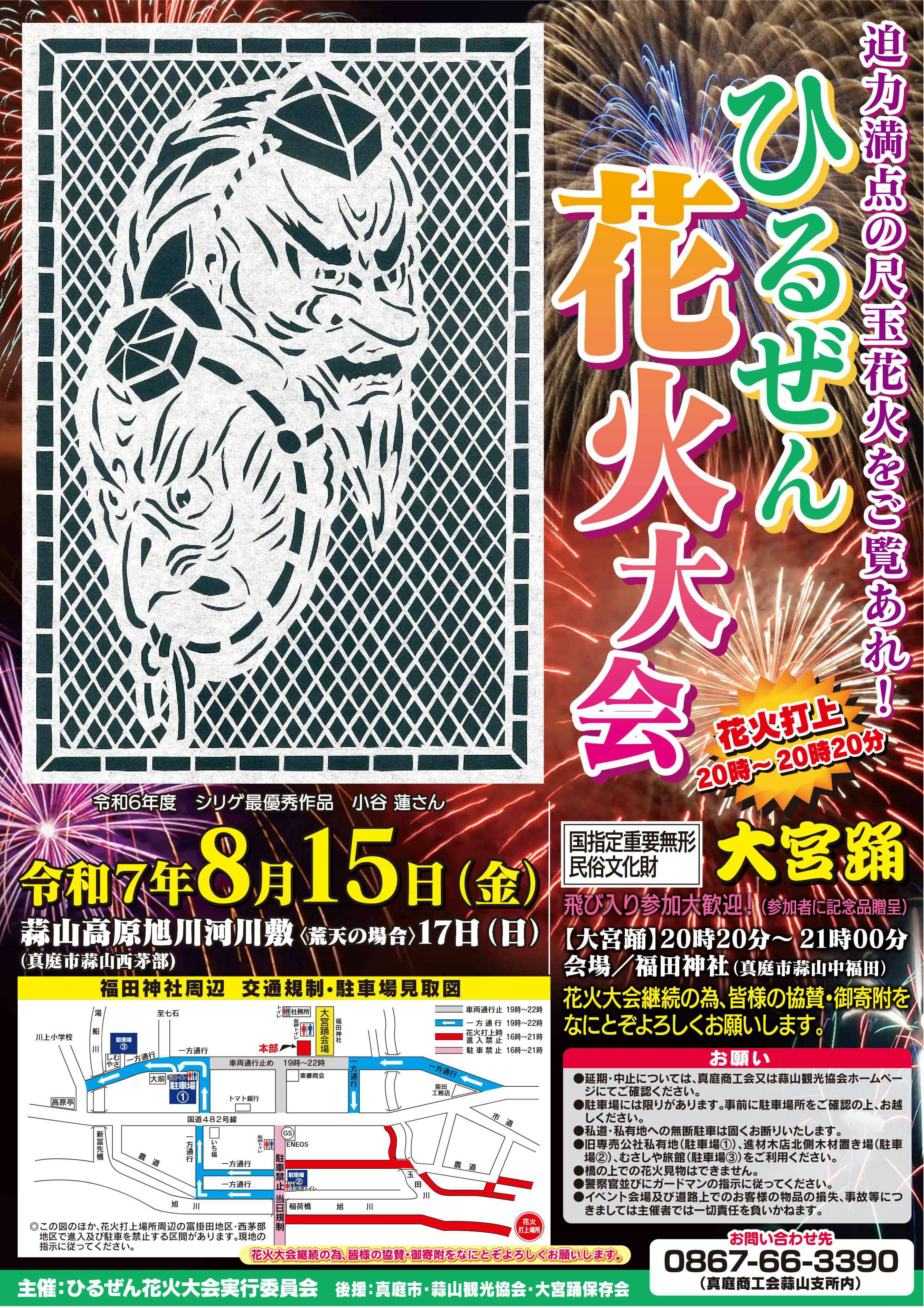 約700発の花火が打ち上がる本花火大会の見どころは、県北でも珍しい「尺玉花火」が上がるところで、蒜山高原の澄んだ夜空に広がる花火と、間近で見る尺玉の迫力は圧巻です。