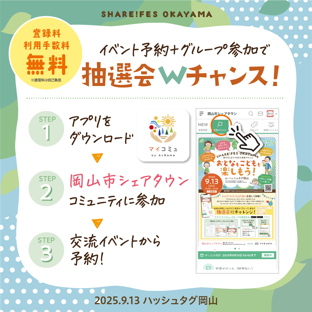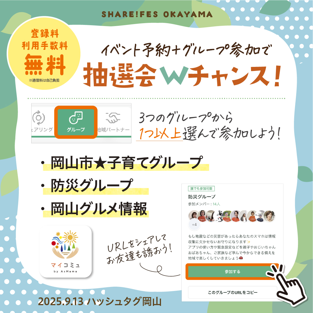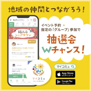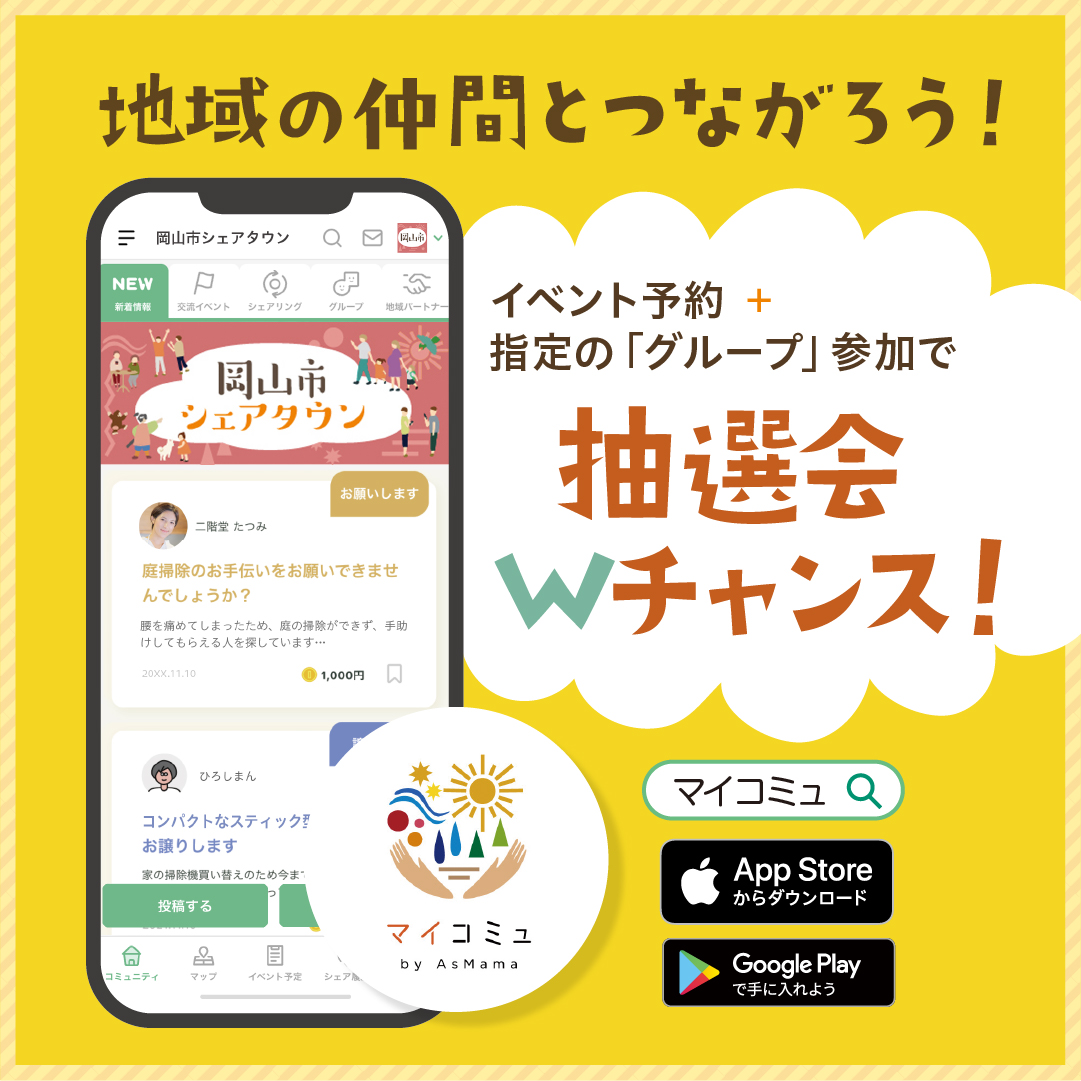“マイコミュ”アプリ内の「岡山市シェアタウン」コミュニティは、登録料無料!