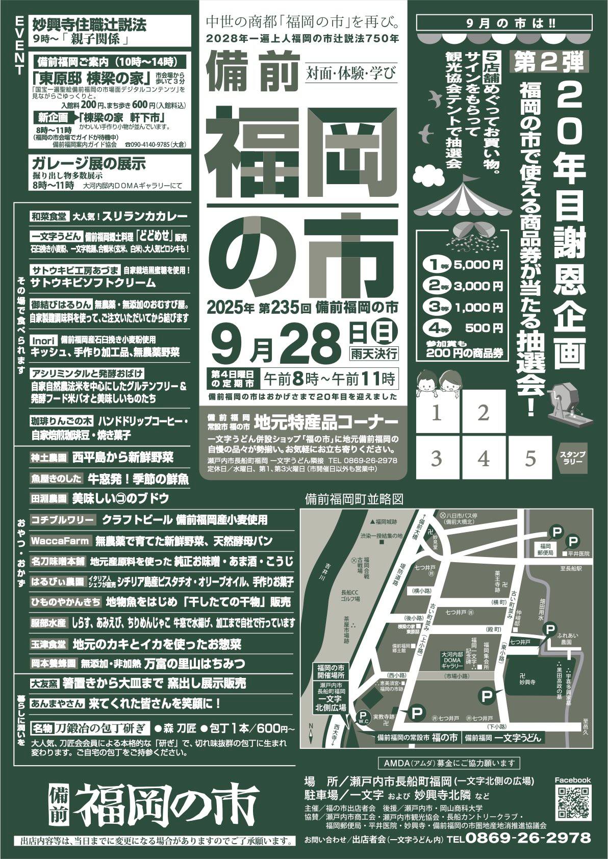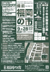 2025.09.21 岡山県内のイベント okayama-kodomo 2025.9.28【第235回備前福岡の市】(瀬戸内市) ポスト シェア はてブ 送る Pocket 【第235回備前福岡の市】 日時:2025年9月28日(日)8:00~11:00 場所:一文字うどん北側の広場(瀬戸内市長船町福岡) ※雨天決行 >>Facebookページ 毎月第4日曜日開催! シェア! ポスト シェア はてブ 送る Pocket feedly