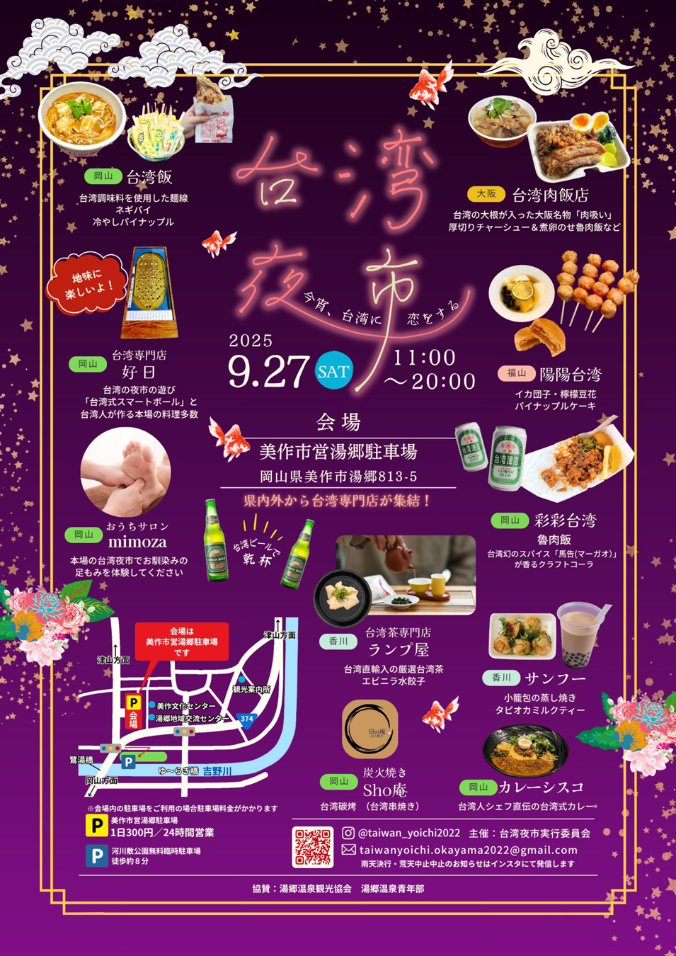 台湾の味や雑貨や文化を楽しめるイベントが、湯郷(美作市営湯郷駐車場)で開催されます。
