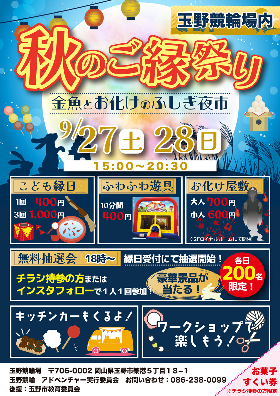玉野競輪場(岡山県玉野市)では、2025年9月27日(土)・28日(日)の2日間、「秋のご縁祭り―金魚とお化けのふしぎ夜市―」を開催いたします。