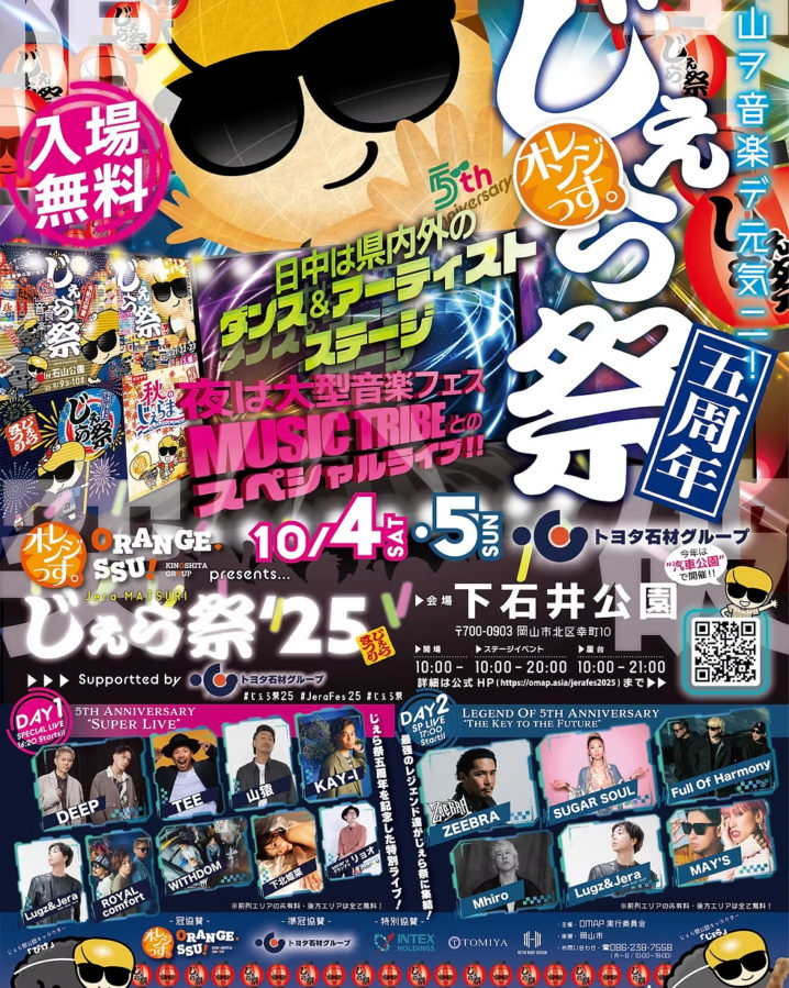 「岡山の夏を 音楽で元気に」をテーマに大型音楽フェス「MUSIC TRIBE(ミュージックトライブ)」のプロデュースや多岐に渡る活動を行っている岡山県出身のアーティスト「Lugz&Jera(ラグズ・アンド・ジェラ)」が発起人となり、2021年コロナ禍の中、初開催。年々規模が拡大し、昨年は3日間の実来場者が2万人を越える過去最高動員を記録。そして2025年、お陰様で5周年を迎え、「じぇら祭’25」を開催。