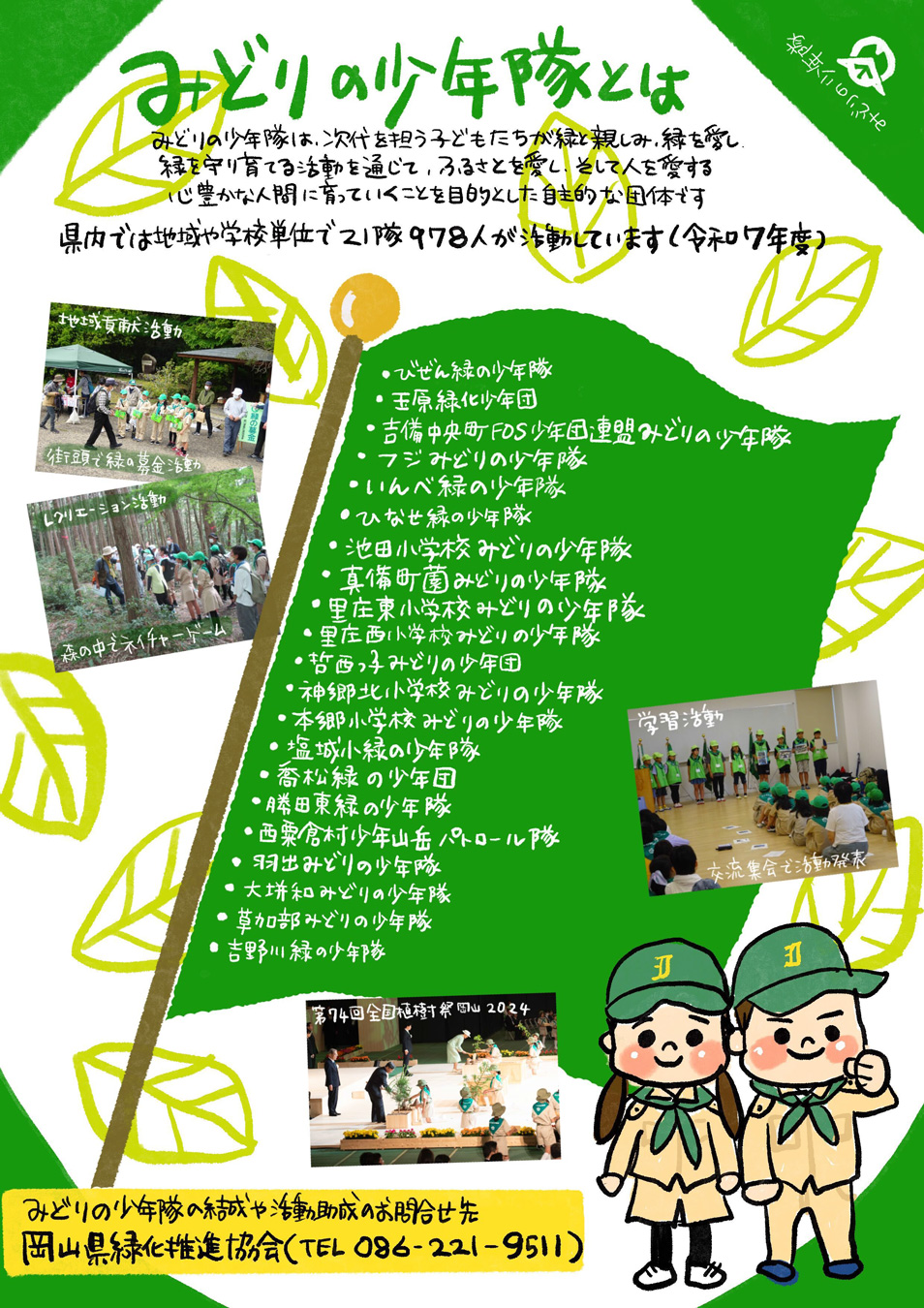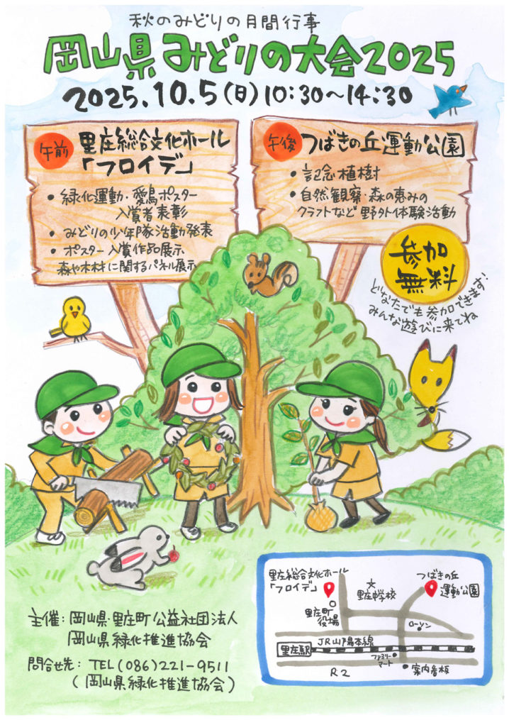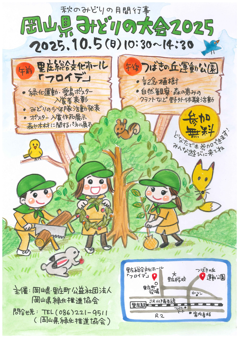 みどりの少年隊をはじめとする児童・生徒や関係者が一堂に集まり、体験活動等を通じて交流を深め、みどりを守り育てる意識の醸成を図ることを目的として「岡山県みどりの大会2025」を開催します。