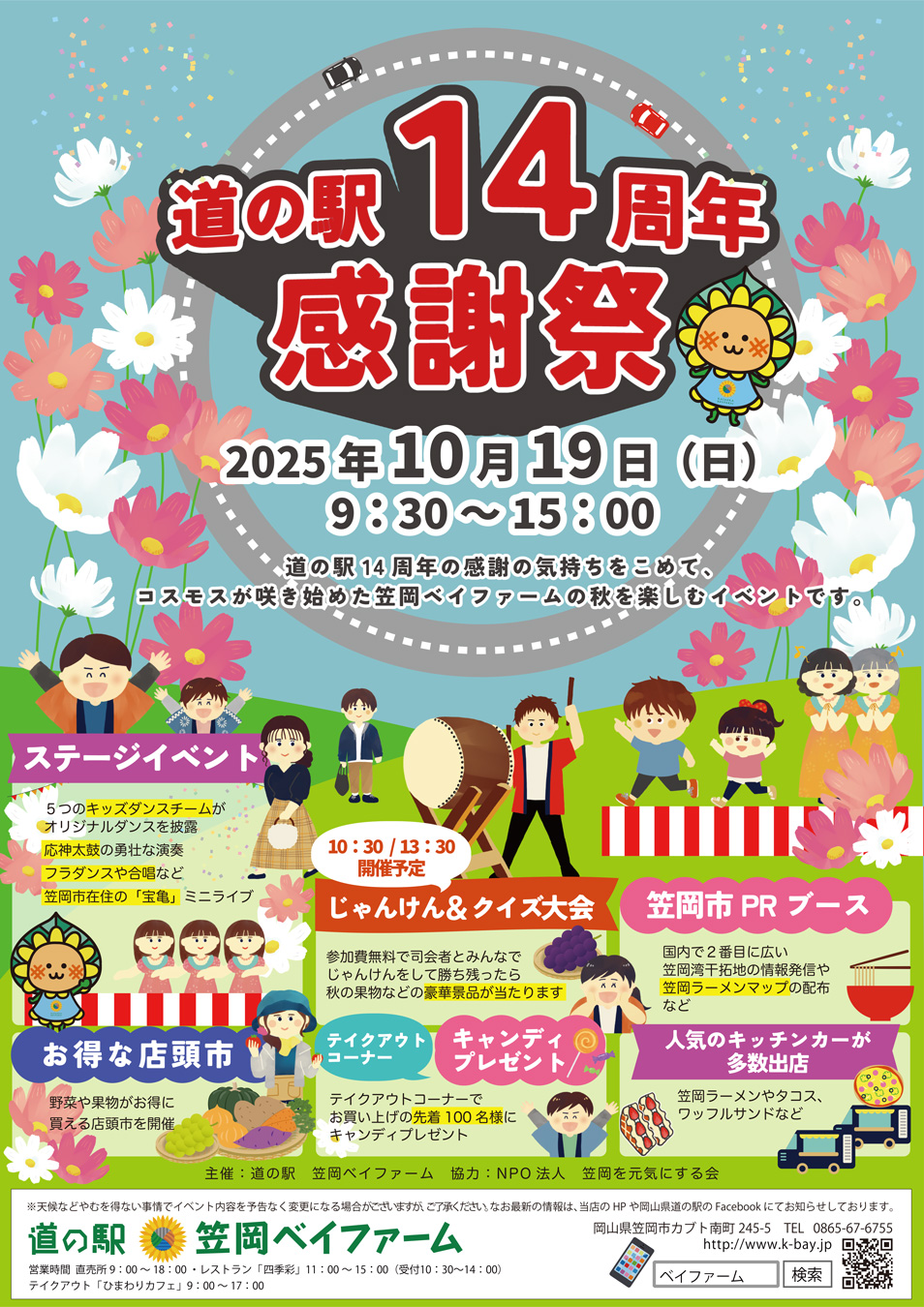 道の駅14周年の感謝をこめて、コスモスが咲き始めた笠岡ベイファームの秋を楽しむイベントです。