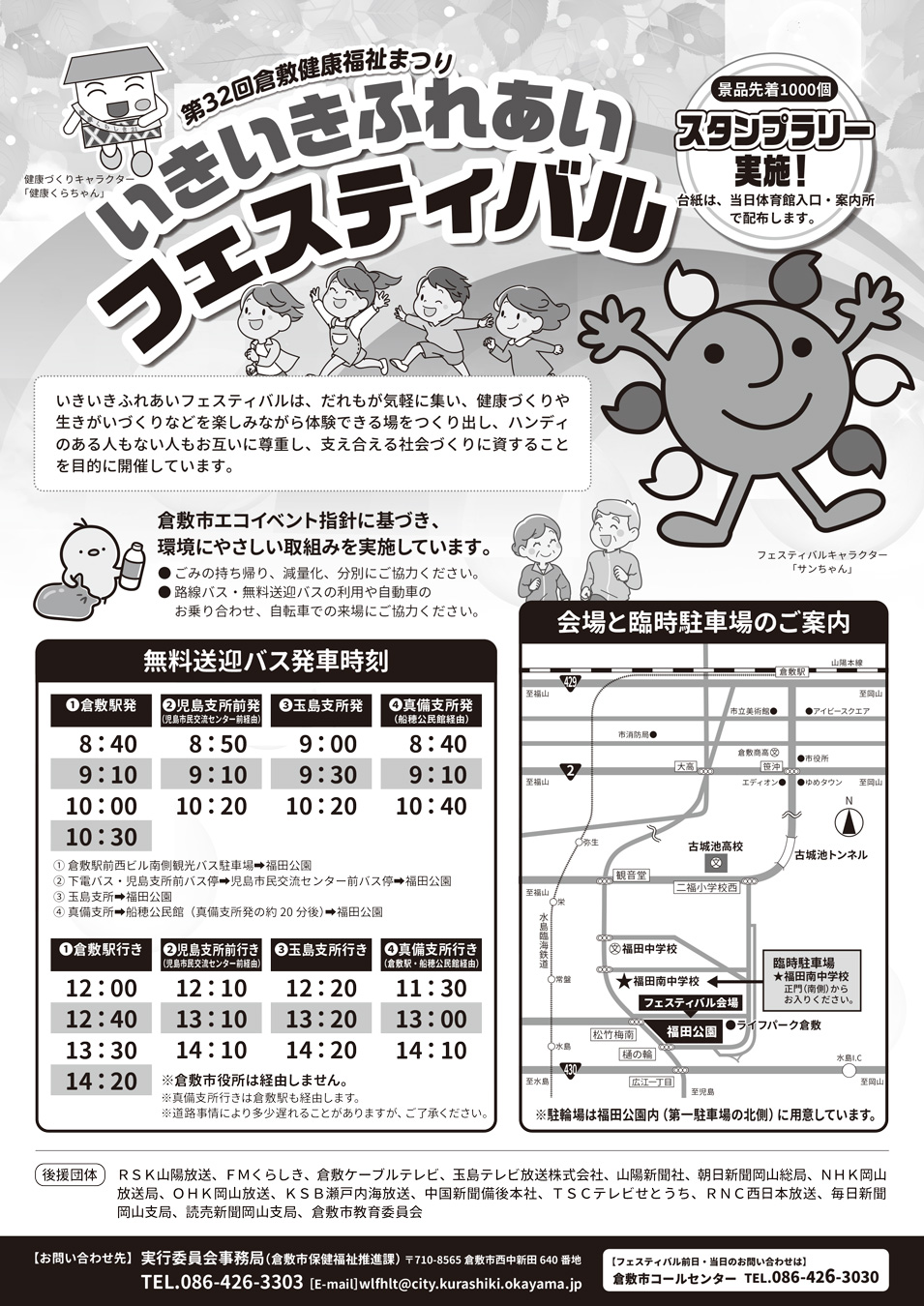 ※倉敷駅前、児島支所前、児島市民交流センター前、玉島支所、真備支所、船穂公民館と福田公園の間で無料送迎バスを運行します。