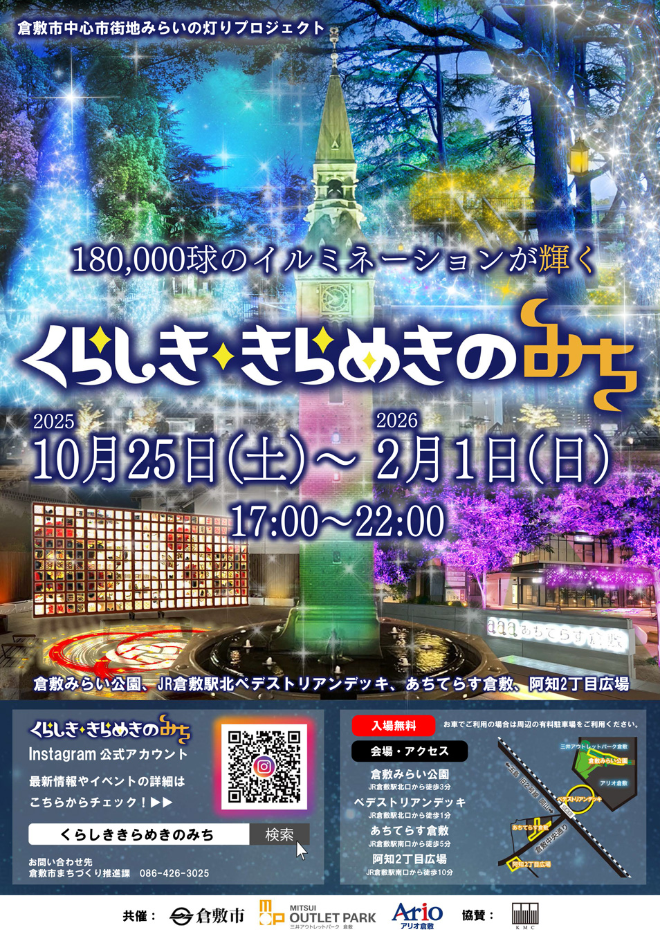 期間:2025年10月25日(土)~2026年2月1日(日)17:00~22:00(阿知2丁目広場のみ21:00まで)
