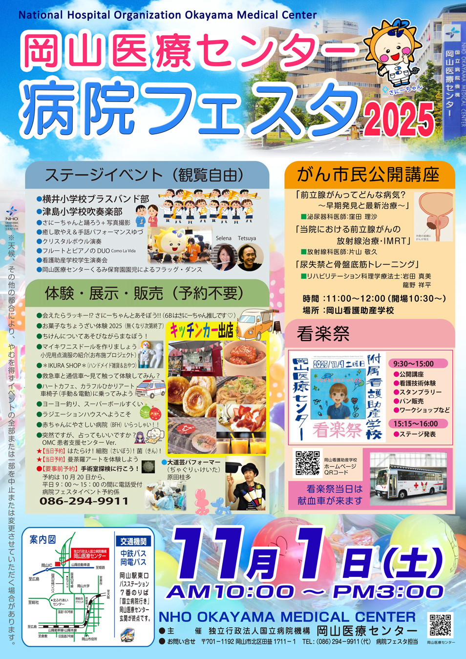 2025.10.22 岡山県内のイベント okayama-kodomo 2025.11.1【岡山医療センター 病院フェスタ】(岡山市北区) ポスト シェア はてブ 送る Pocket 【岡山医療センター 病院フェスタ】 日時:2025年11月1日(土)10:00~15:00 場所:国立病院機構 岡山医療センター(岡山市北区田益1711-1) >> シェア! ポスト シェア はてブ 送る Pocket feedly