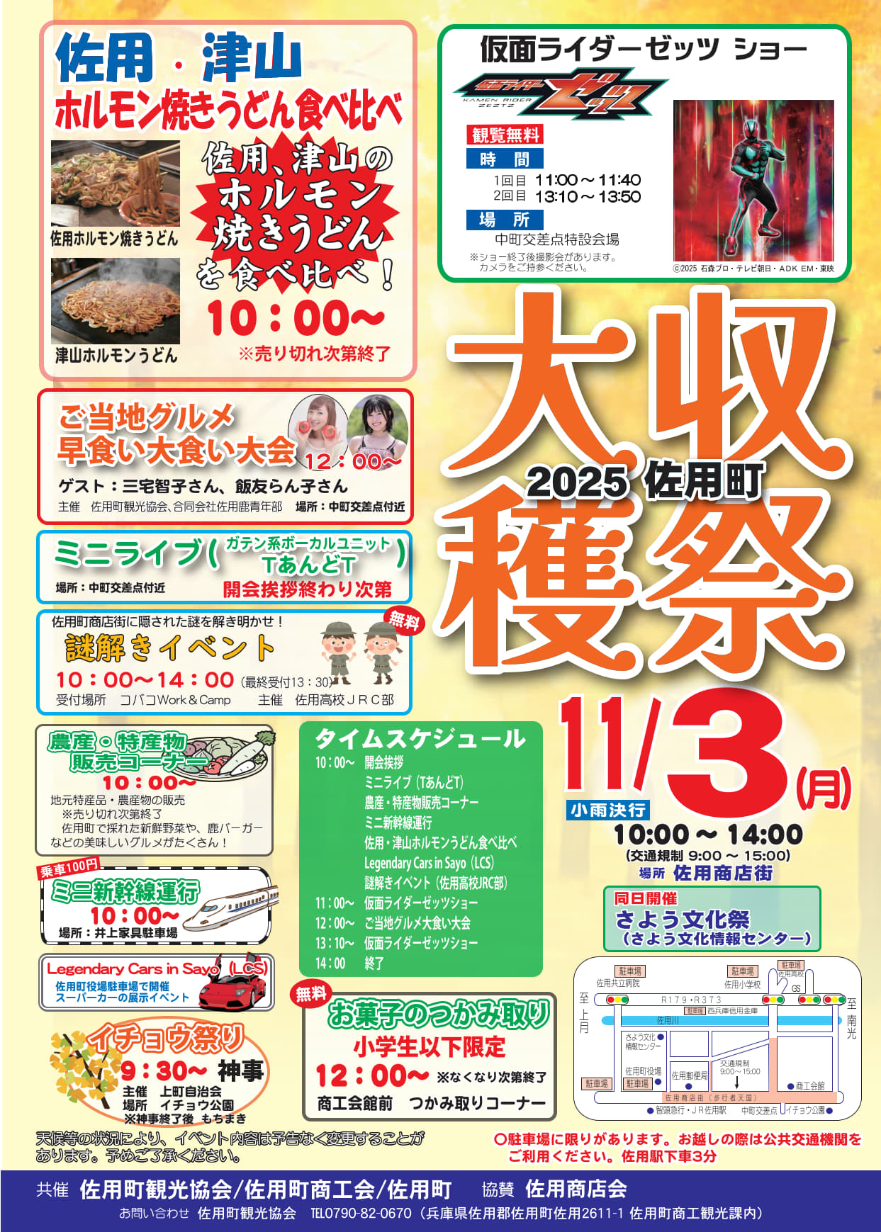 佐用町でとれた野菜などの農産物や特産物、しかバーガーなどのおいしいグルメが楽しめるほか、佐用と津山のホルモンうどん食べ比べ、ご当地グルメ大食い大会、キャラクターショー、ミニ新幹線運行など盛りだくさん♪