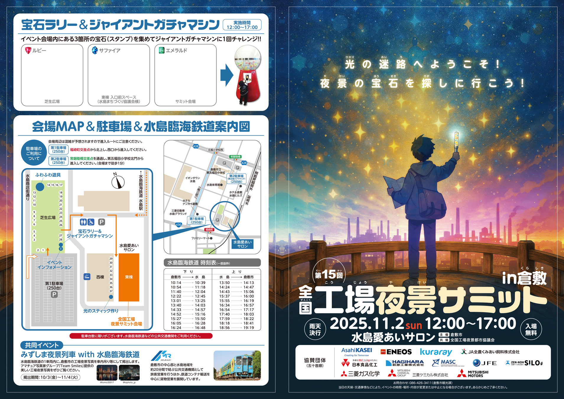 倉敷市の工場夜景都市としての認知度向上や他都市との交流を通じた夜型観光の推進を目的として「第15回 全国工場夜景サミットin倉敷」が開催されます。