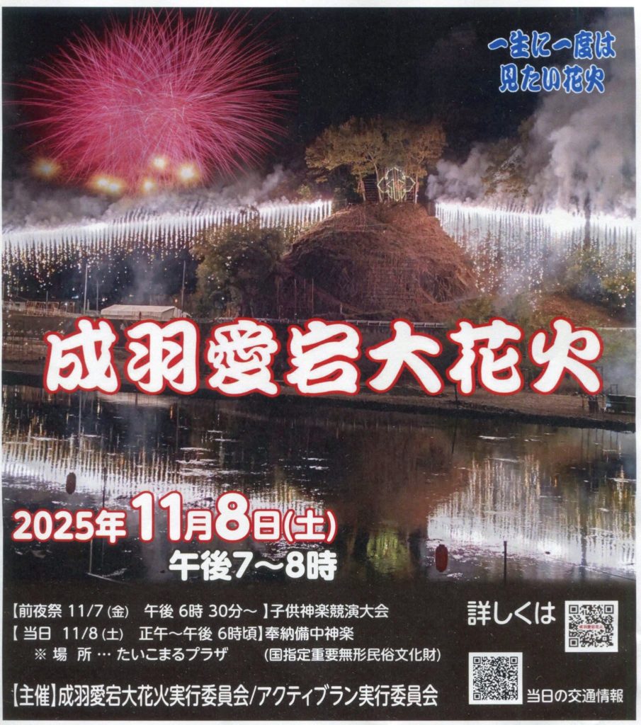 2025.11.8【備中名物成羽愛宕大花火】(高梁市成羽町) okayama-kodomo 3か月前 【備中名物成羽愛宕大花火】 日時:2025年11月8日(土)19:00~20:00 場所:高梁市成羽町下原地区(成羽川の河川敷)(高梁市成羽町下原) ※荒天中止 >>公式情報はこちら >>Facebookページ この記事をシェアするTwitterFacebookLINEで送る