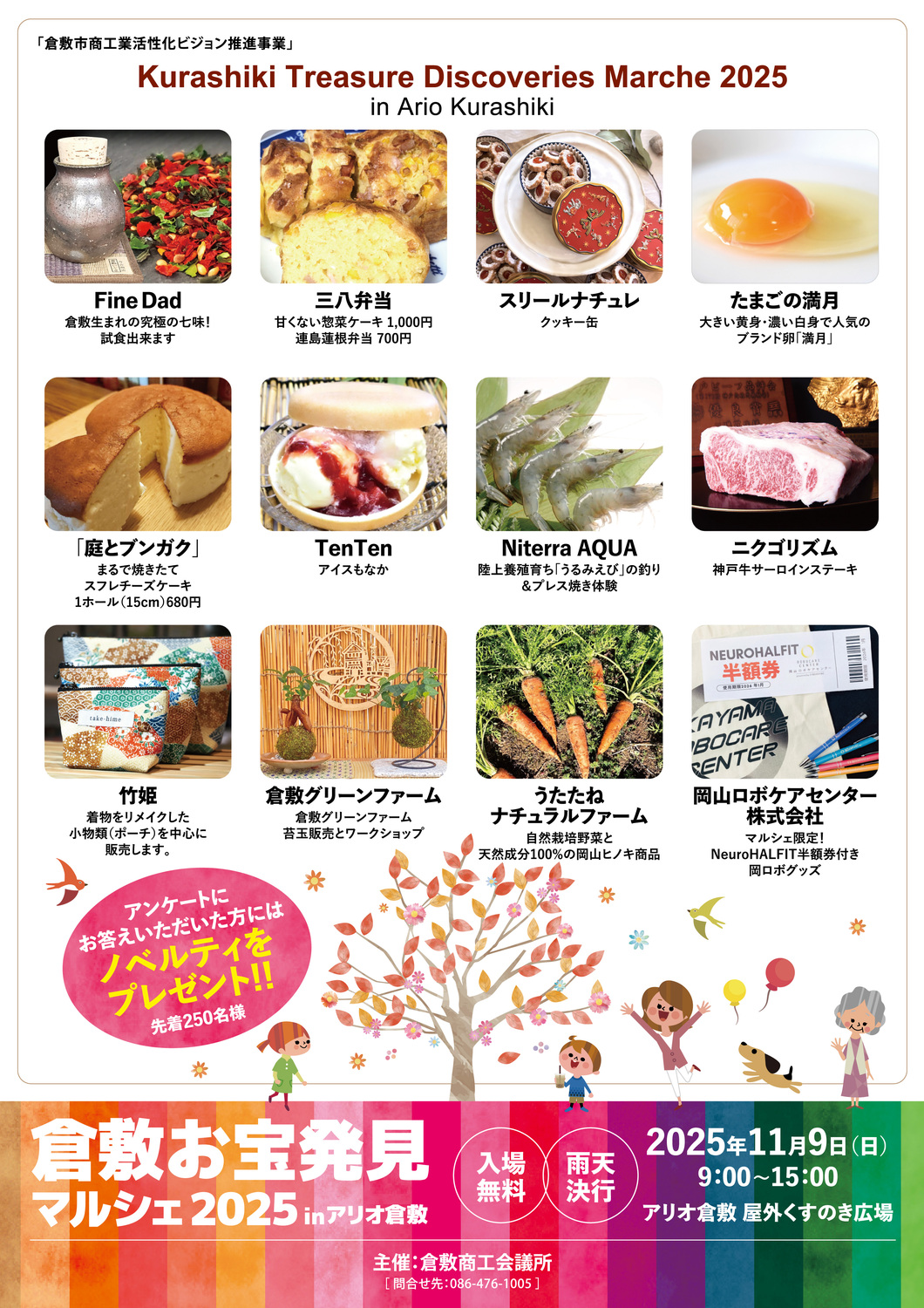 2025.10.31 岡山県内のイベント okayama-kodomo 2025.11.9【倉敷お宝発見マルシェ2025 in アリオ倉敷】(倉敷市) ポスト シェア はてブ 送る Pocket 【倉敷お宝発見マルシェ2025 in アリオ倉敷】 日時:2025年11月9日(日)9:00~15:00 場所:アリオ倉敷 屋外くすのき広場(倉敷市寿町12−1) >>公式情報はこちら 主催:倉敷商工会議所 シェア! ポスト シェア はてブ 送る Pocket feedly