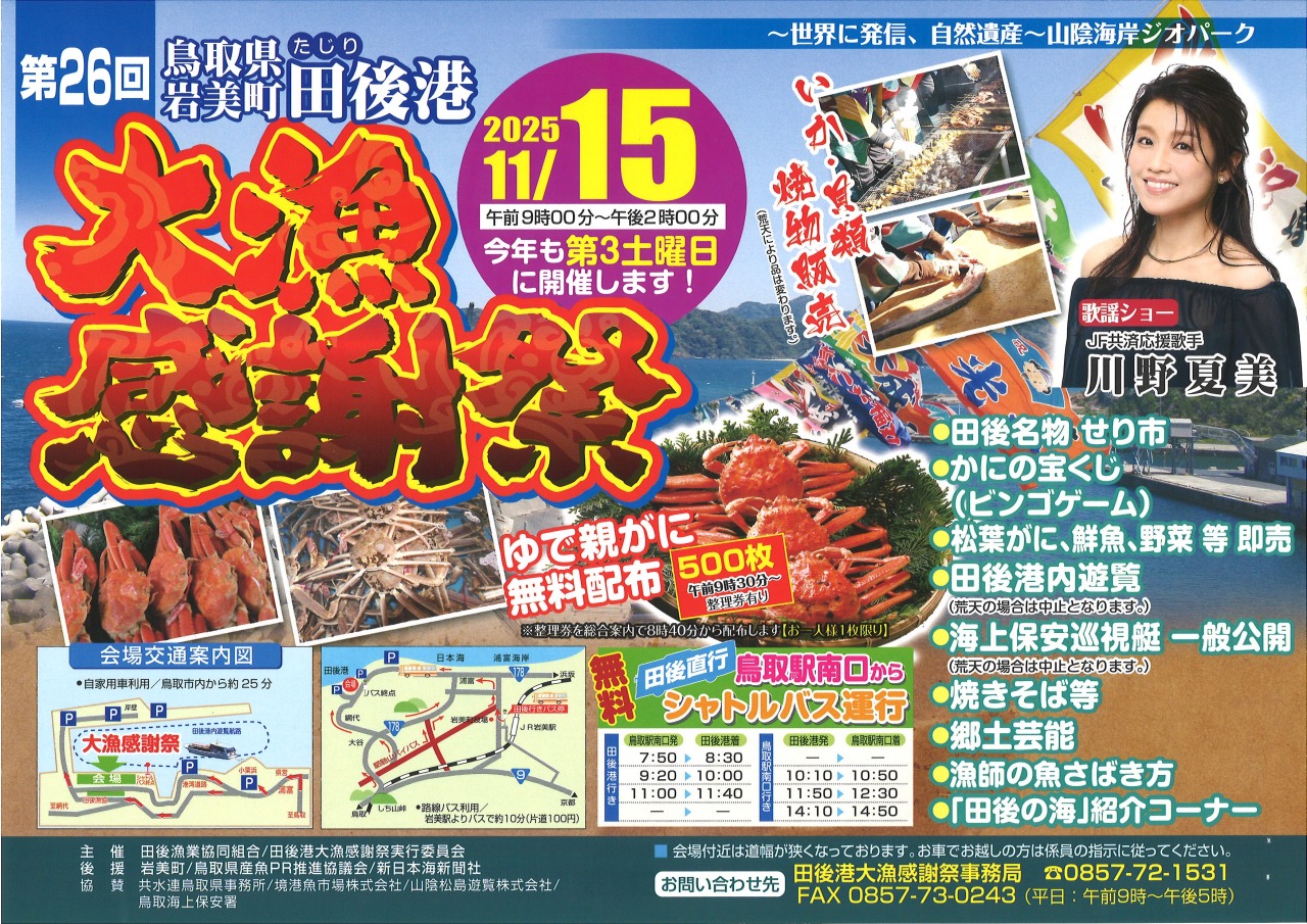 当日は、「松葉がに」をはじめ新鮮な魚などの即売、かにの宝くじ(ビンゴゲーム)、ゆで親がに無料配布(先着500名)、歌謡ショーなど盛りだくさんの内容です。