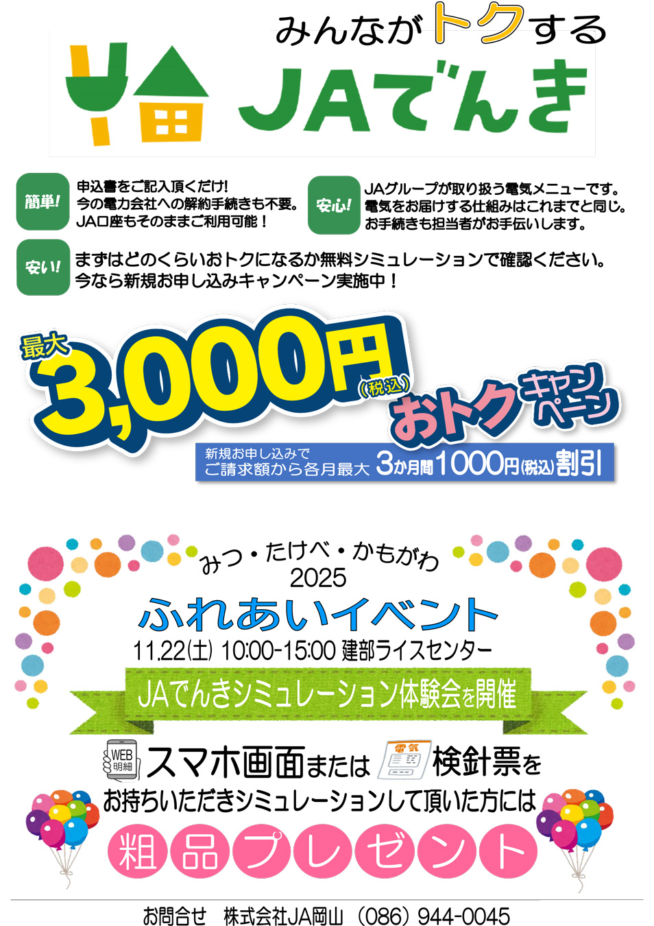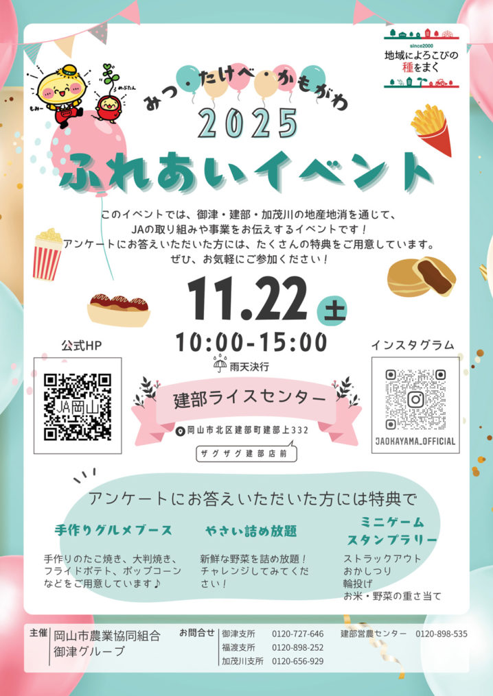 このイベントでは、御津・建部・加茂川の地産地消を通じて、JAの取り組みや事業をお伝えするイベントです。